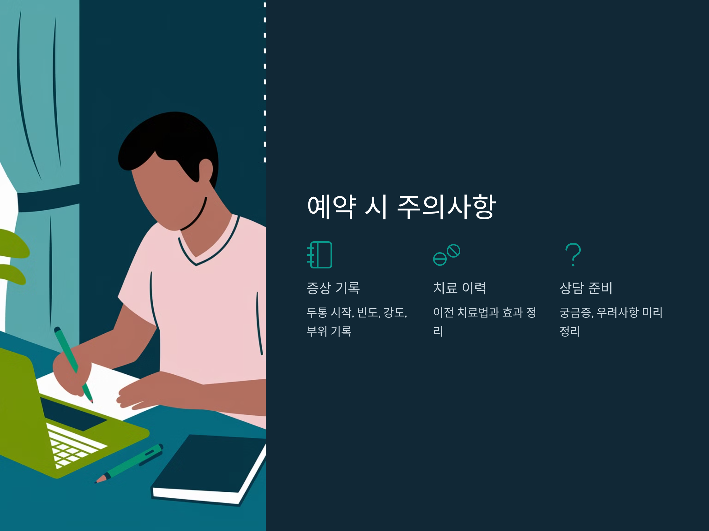 셋째, 예약 후에는 치료에 대한 궁금증이나 우려사항을 미리 의사와 상담할 수 있도록 준비합니다. 신경 차단술의 효과와 부작용 등에 대해 충분히 알고 있는 상태에서 치료를 받는 것이 중요합니다.