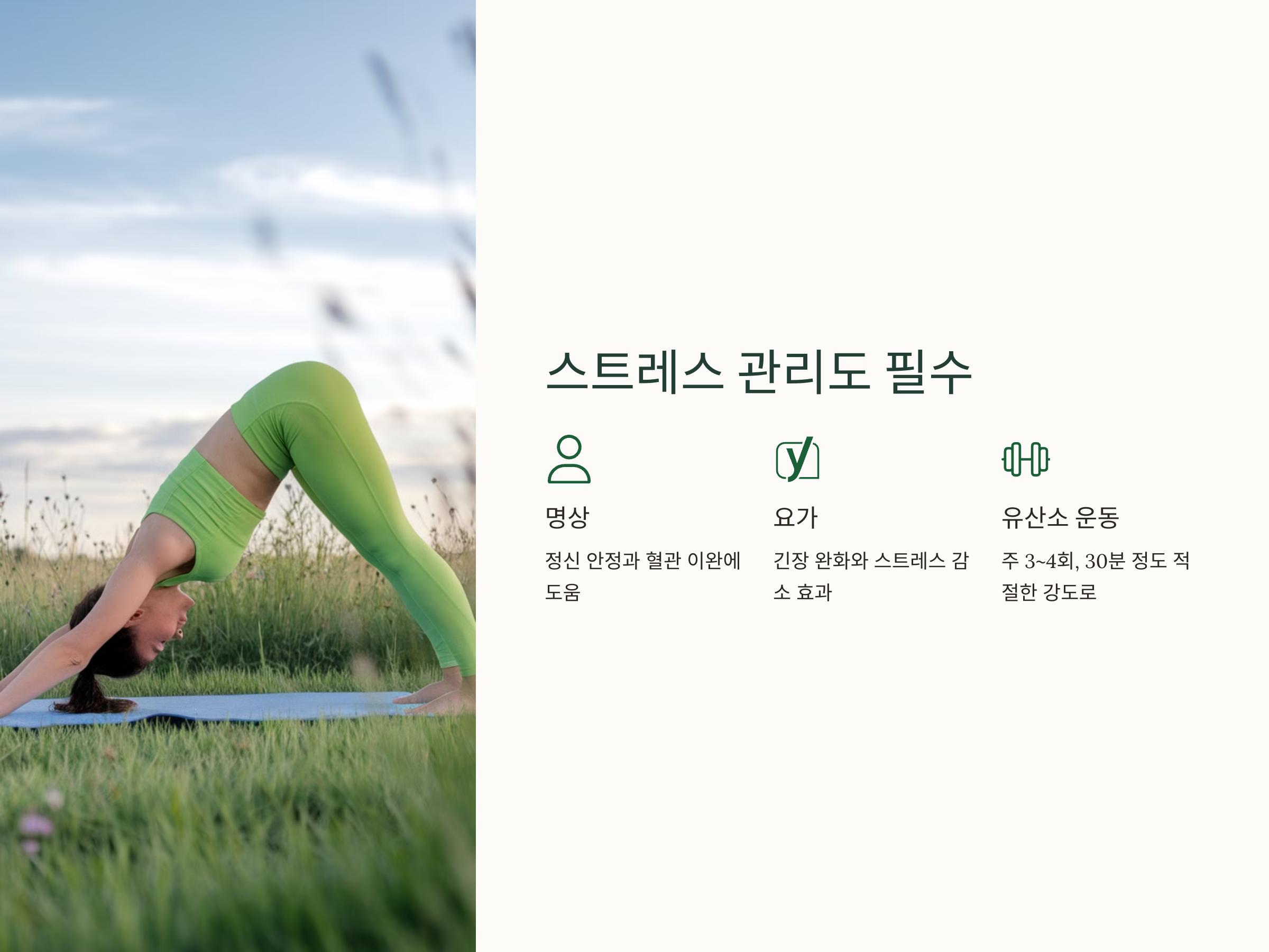 - 스트레스 관리: 명상, 요가, 가벼운 운동을 통해 긴장 완화