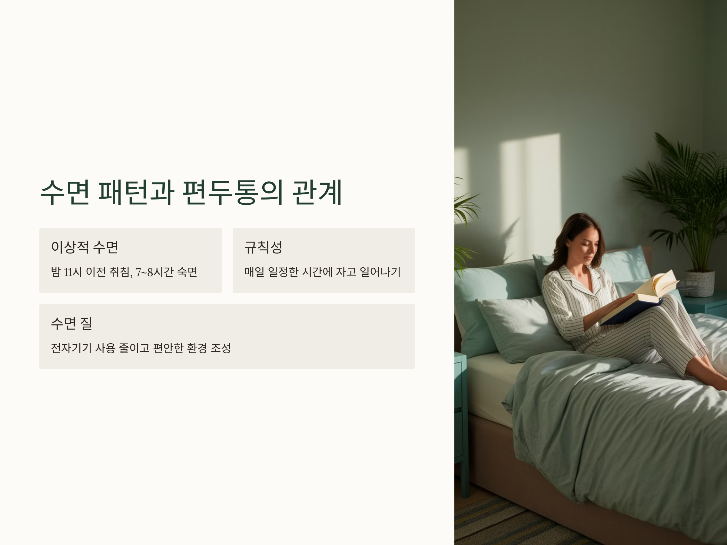 수면 부족이나 과도한 수면은 편두통을 유발하는 주요 원인 중 하나입니다. 연구 결과에 따르면 매일 일정한 시간에 자고 일어나는 것이 편두통 예방에 도움이 된다고 합니다. 특히 밤 11시 이전에 취침하고 7~8시간 정도 숙면을 취하는 것이 가장 이상적인 수면 패턴으로 꼽힙니다.