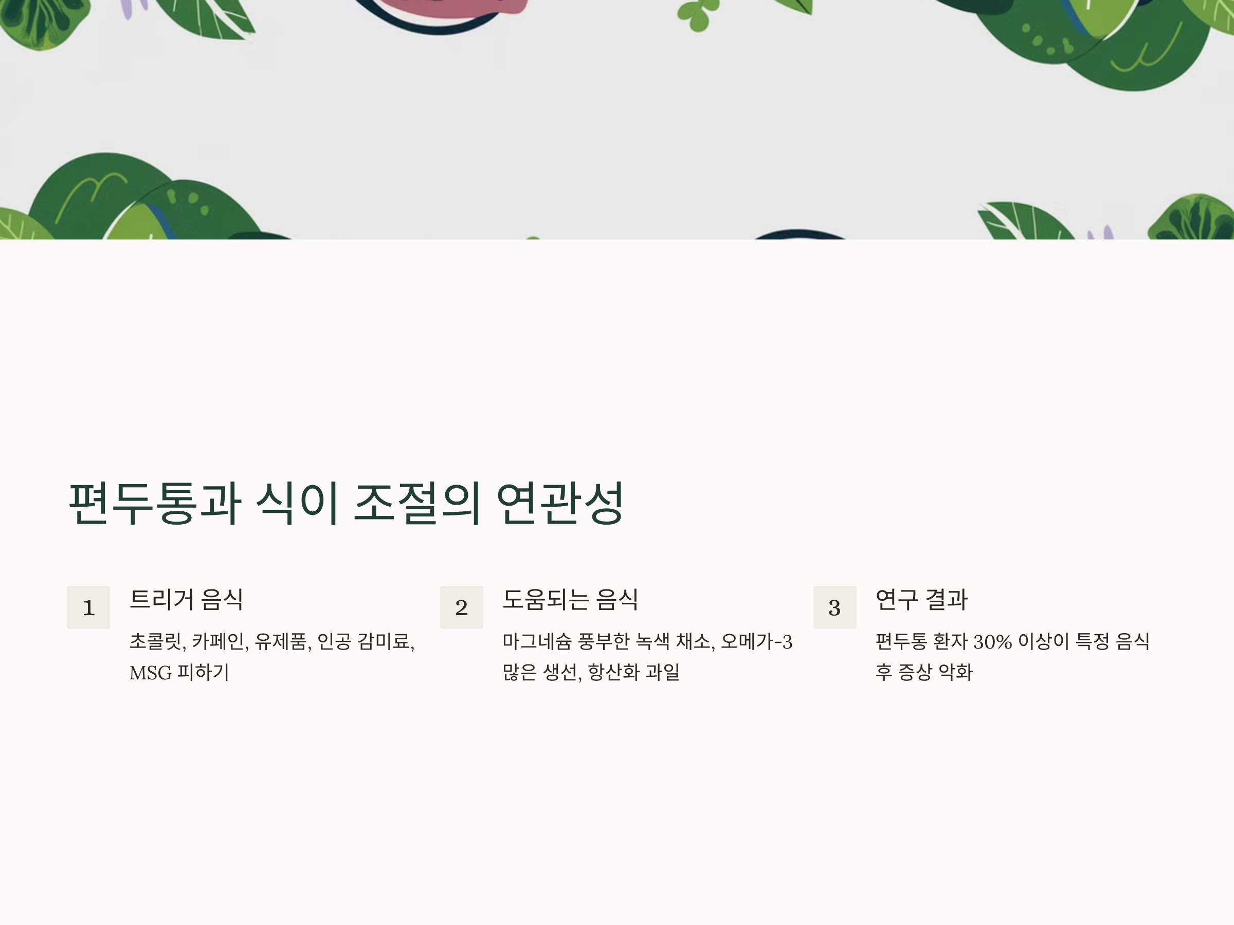 - 트리거 음식 피하기: 초콜릿, 카페인, 유제품 등 편두통을 유발하는 음식을 줄이기