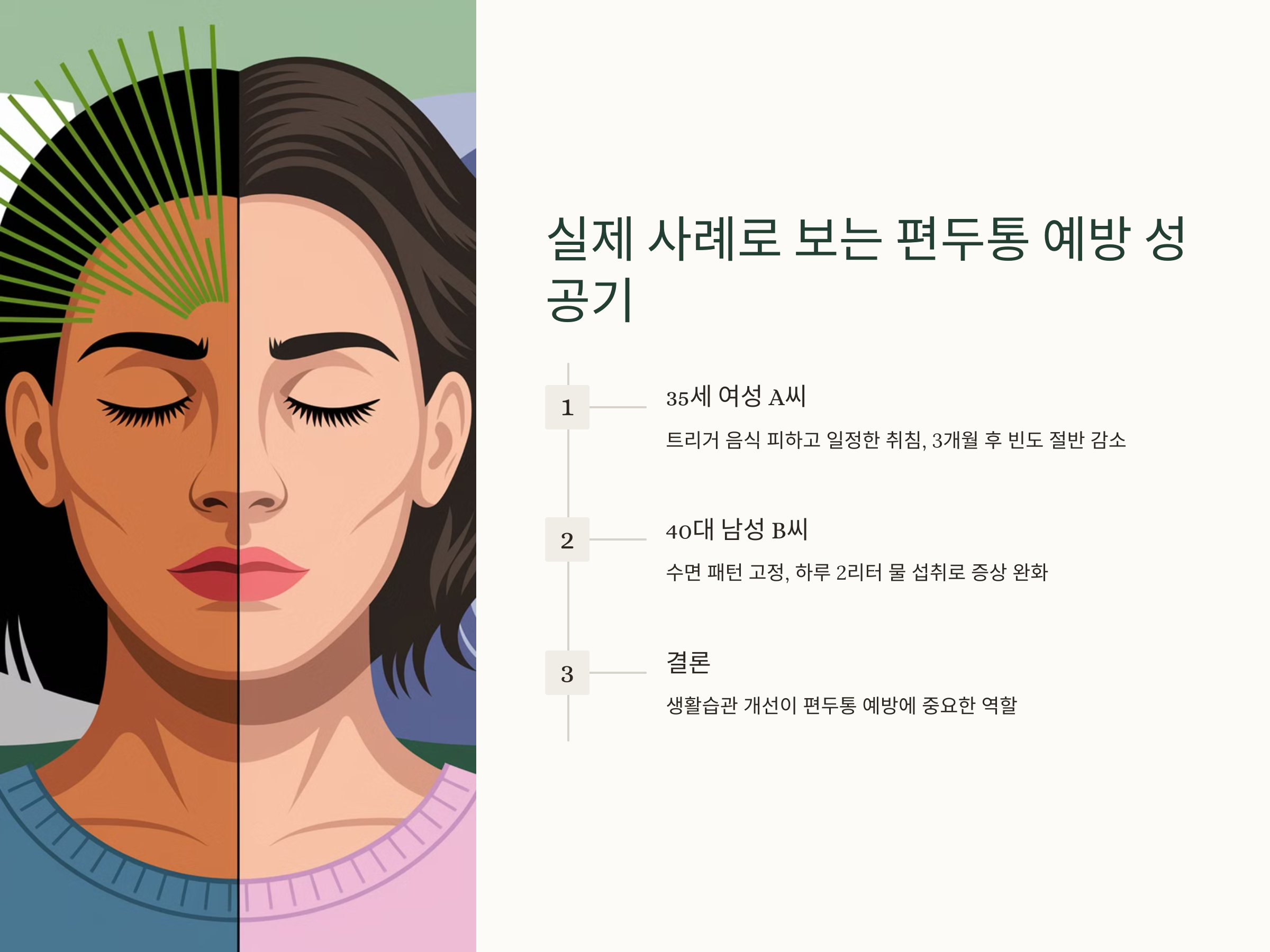 또 다른 사례로, 40대 남성 B씨는 스트레스와 불규칙한 식습관이 원인으로 편두통이 심했지만, 수면 패턴을 고정하고 하루 2리터 이상의 물을 마시는 습관을 들이면서 증상이 완화되었습니다. 이런 사례들은 생활습관 개선이 편두통 예방에 중요한 역할을 한다는 점을 시사합니다.