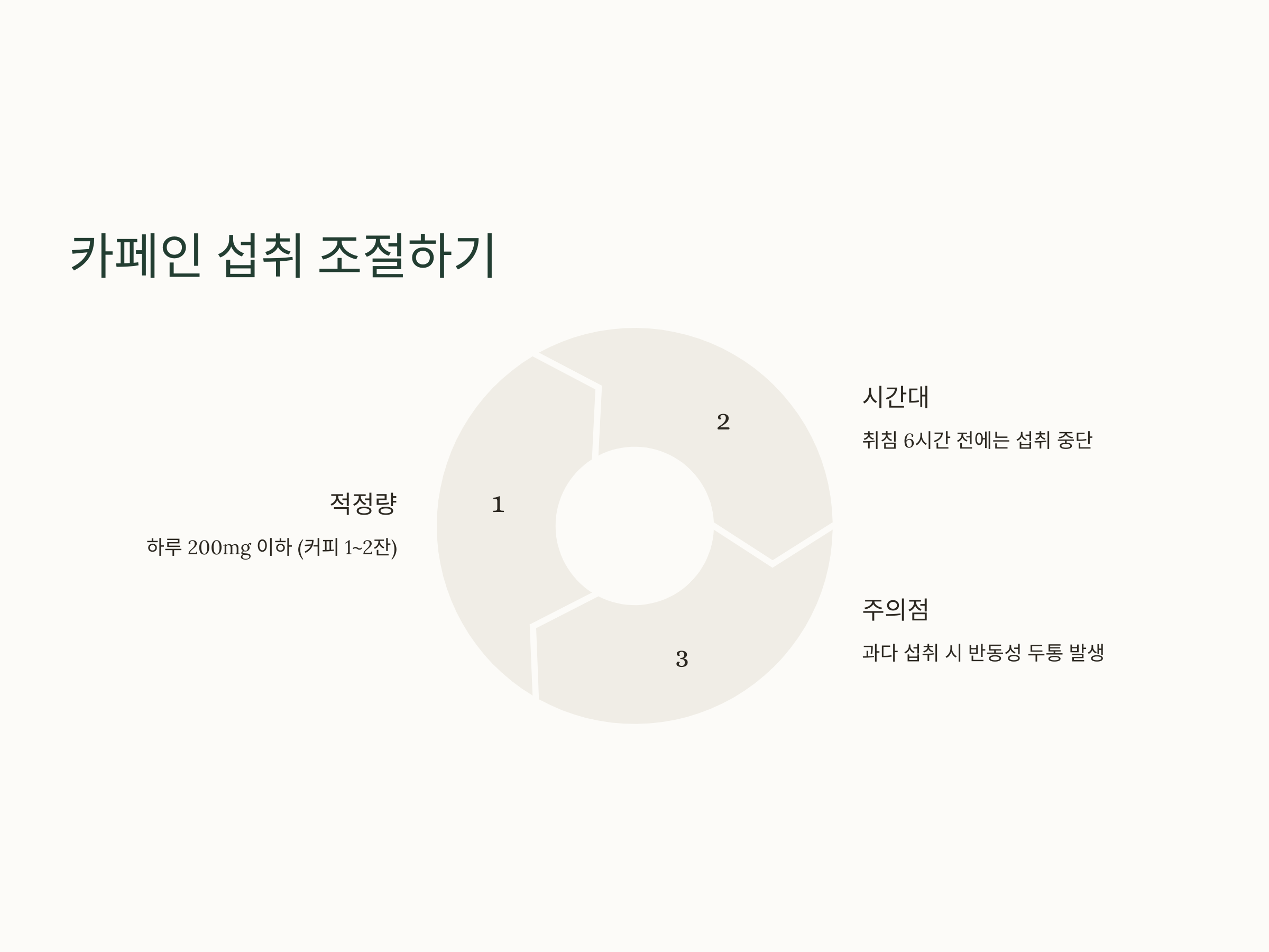- 카페인 조절: 하루 200mg 이하로 섭취하며 저녁에는 피하기