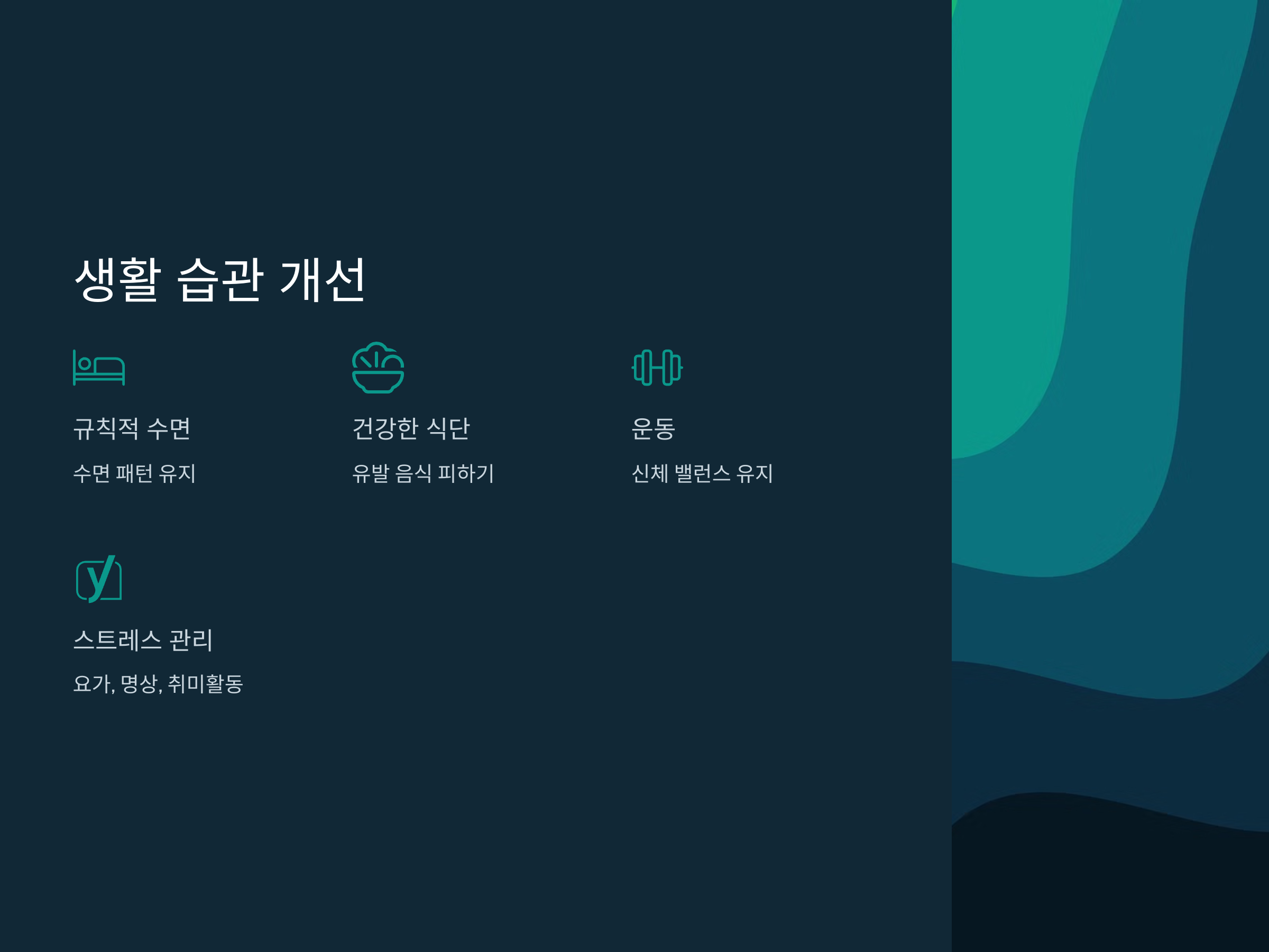 - 스트레스 관리(요가, 명상, 취미활동)