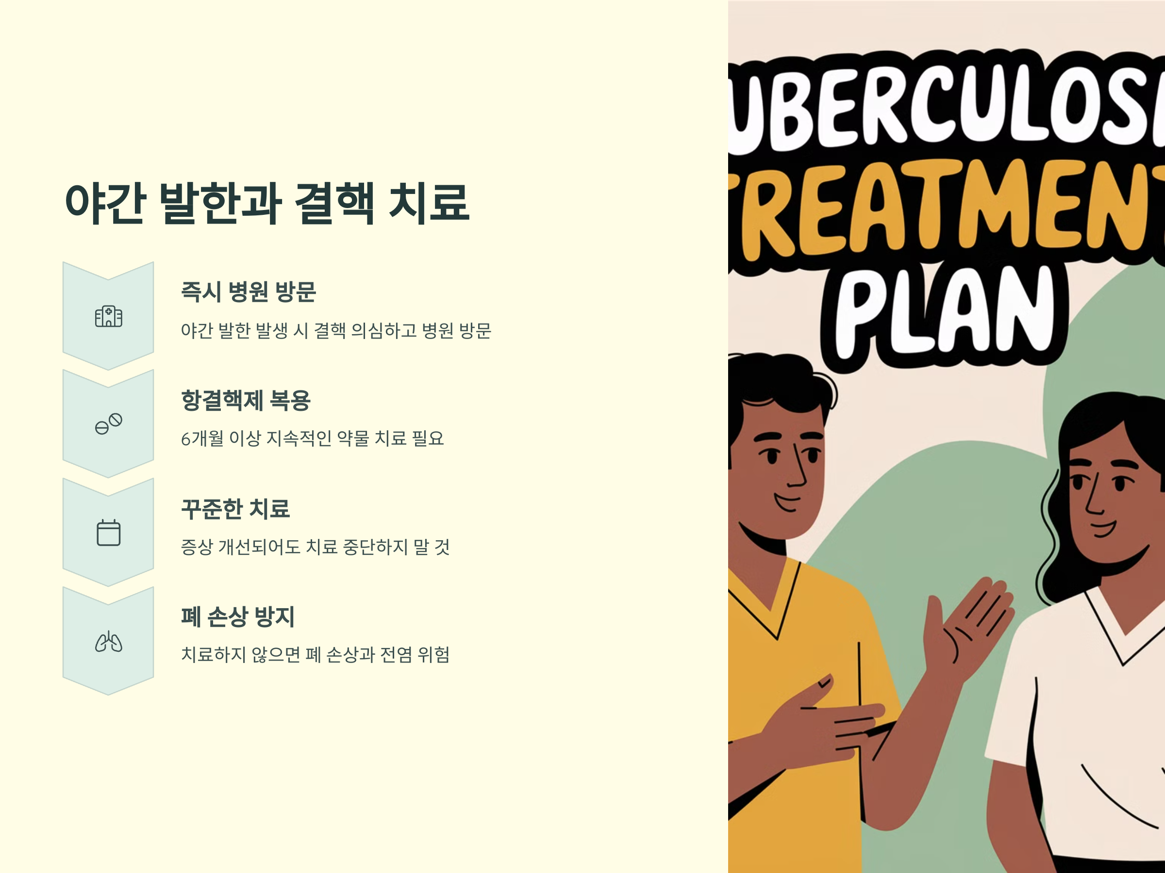 폐결핵에서 발생하는 야간 발한은 질병이 어느 정도 진행된 상태에서 나타날 수 있습니다. 따라서, 야간 발한이 나타난다면 결핵을 의심하고 즉시 병원을 찾아야 합니다. 폐결핵의 치료는 보통 항결핵제를 복용하는 형태로 이루어지며, 이 치료는 6개월 이상 지속될 수 있습니다. 치료를 받지 않으면 폐결핵은 폐를 심각하게 손상시킬 수 있으며, 다른 사람에게 전염될 위험도 존재합니다.
