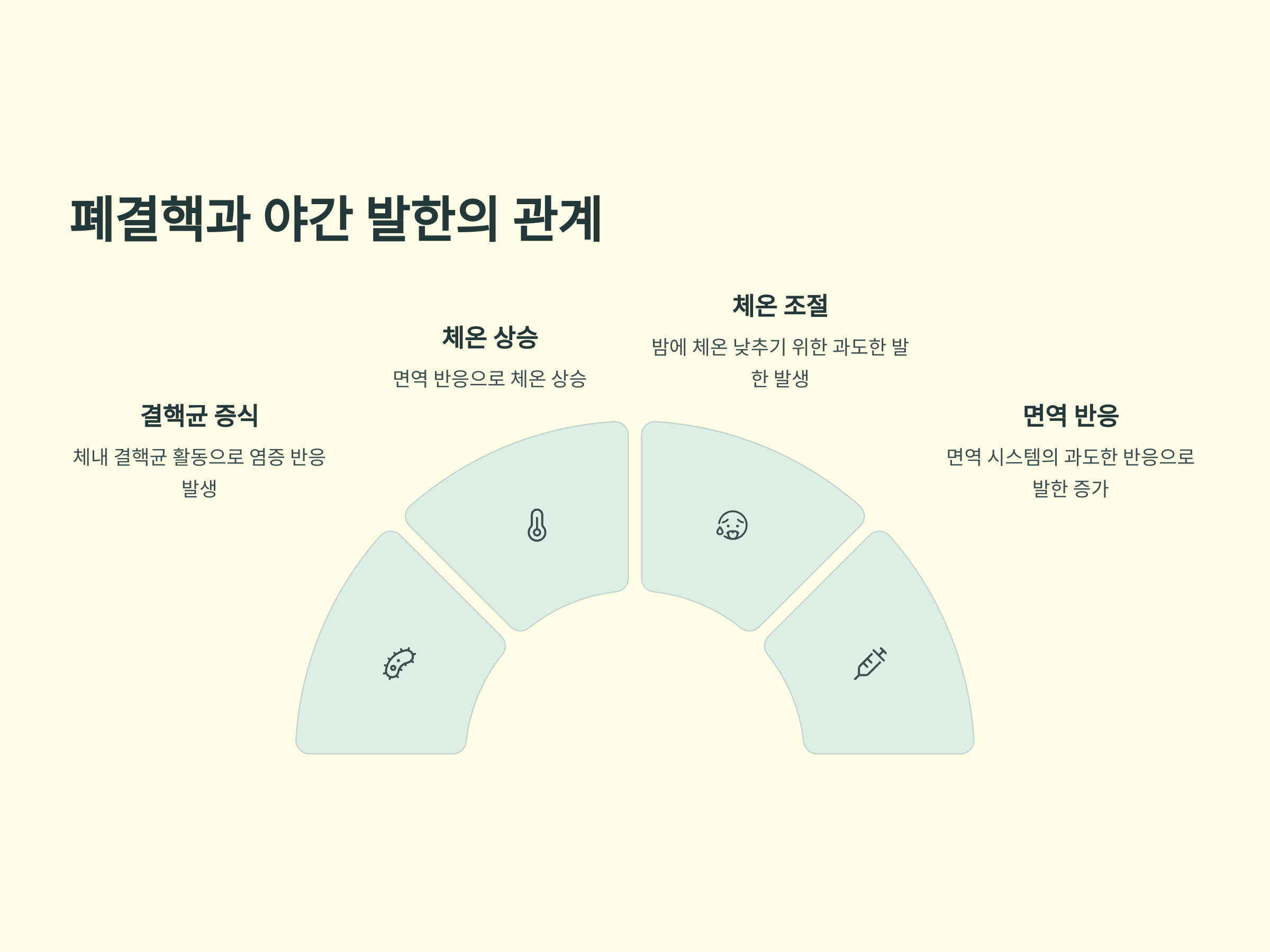 폐결핵에서 나타나는 야간 발한은 결핵균이 체내에서 활발하게 증식하는 과정 중 발생할 수 있는 증상입니다. 결핵균이 폐에 감염되면 면역 시스템이 이를 감지하고 염증 반응을 일으킵니다. 이로 인해 체온이 상승하게 되며, 특히 밤에 체온이 떨어지려는 과정에서 과도한 발한이 발생하게 됩니다. 밤에 땀이 많이 나는 이유는 몸의 자연적인 체온 조절 기능이 작동하면서 온도를 낮추기 위해 발생하는 반응입니다.