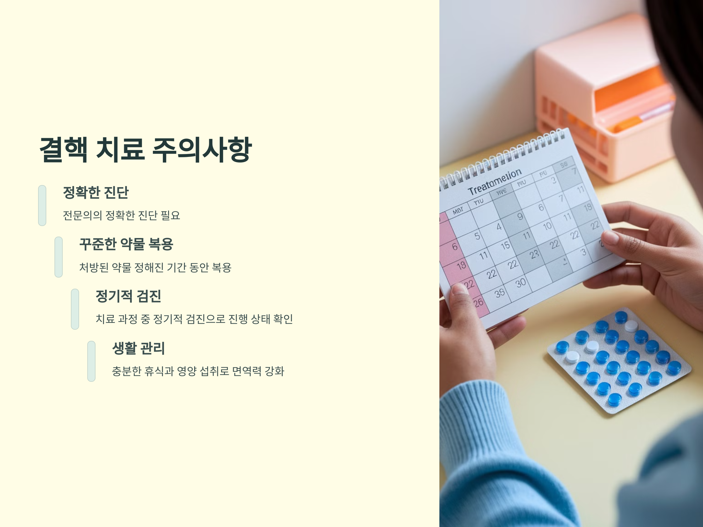 결핵 치료는 지속적으로 약물을 복용하는 것이 핵심입니다. 치료 도중에 증상이 개선되더라도 약물 복용을 중단하면 결핵균이 다시 증식할 수 있습니다. 따라서 치료 기간 동안은 반드시 의사의 지시에 따라 약을 꾸준히 복용해야 합니다.