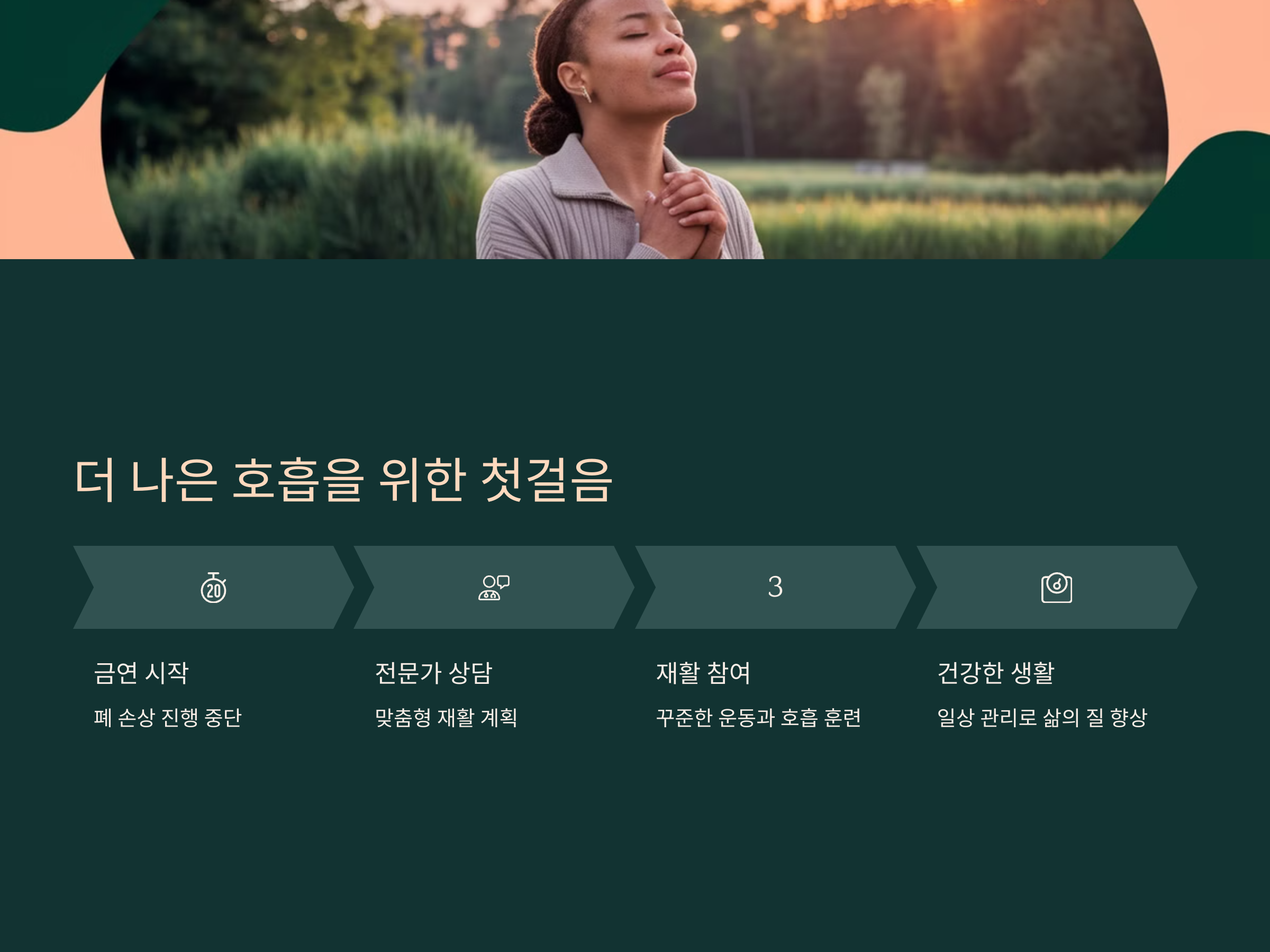 폐기종 개선을 위한 첫걸음은 여러분의 건강한 삶을 위한 중요한 투자입니다. 이제부터는 금연과 폐 재활 치료로 호흡을 되찾고, 더 나은 삶을 살아보세요.
