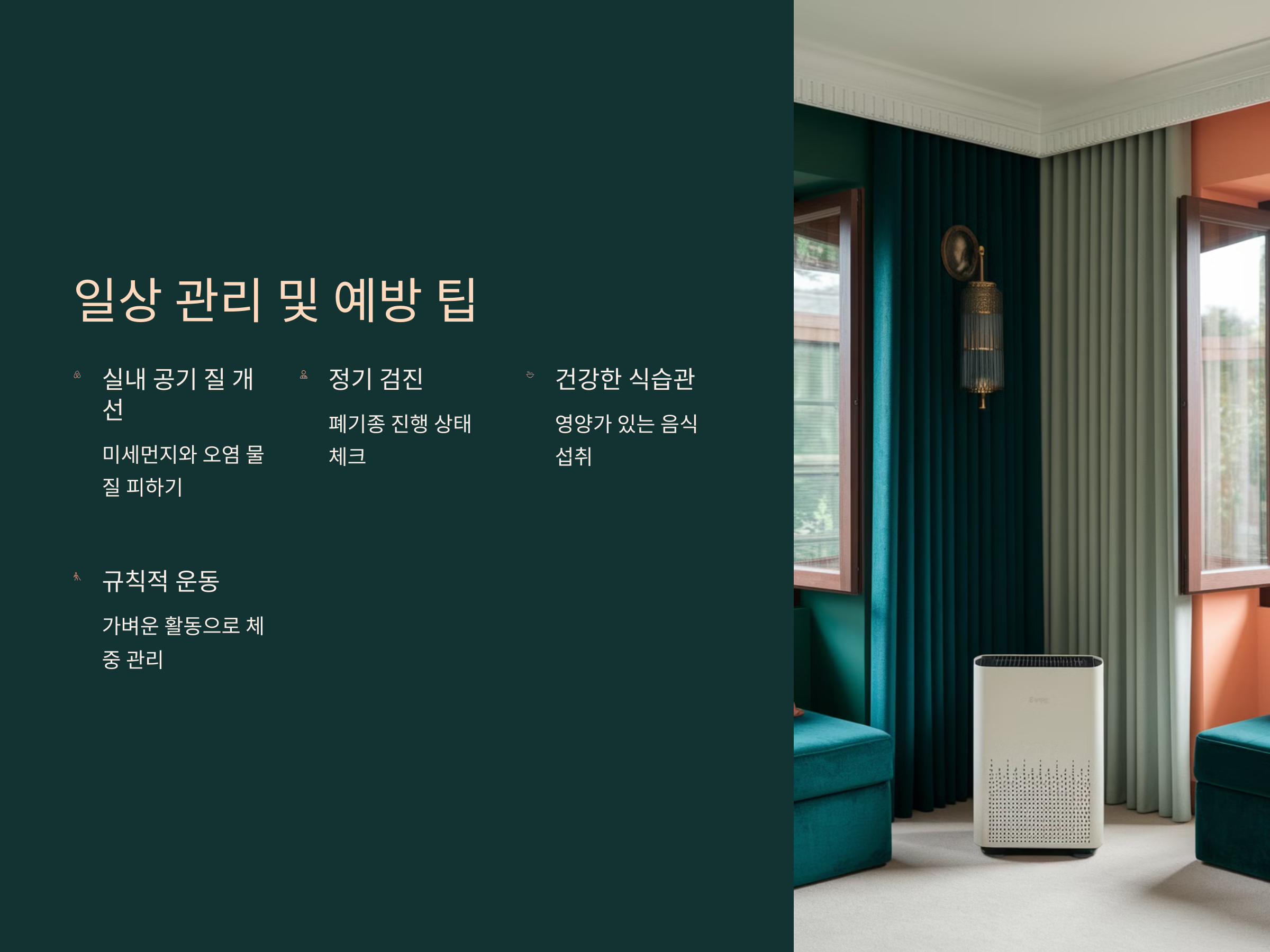 폐기종 환자는 치료뿐만 아니라, 일상적인 관리와 예방에도 신경을 써야 합니다. 먼저, 금연은 당연히 해야 할 일이지만, 환경적인 요인도 중요한 영향을 미칩니다. 예를 들어, 실내 공기 질을 개선하고, 미세먼지나 오염된 공기에서 벗어나는 것이 필요합니다. 또한, 정기적인 병원 방문을 통해 폐기종의 진행 상태를 체크하고, 필요시 조기 치료를 받는 것이 중요합니다.