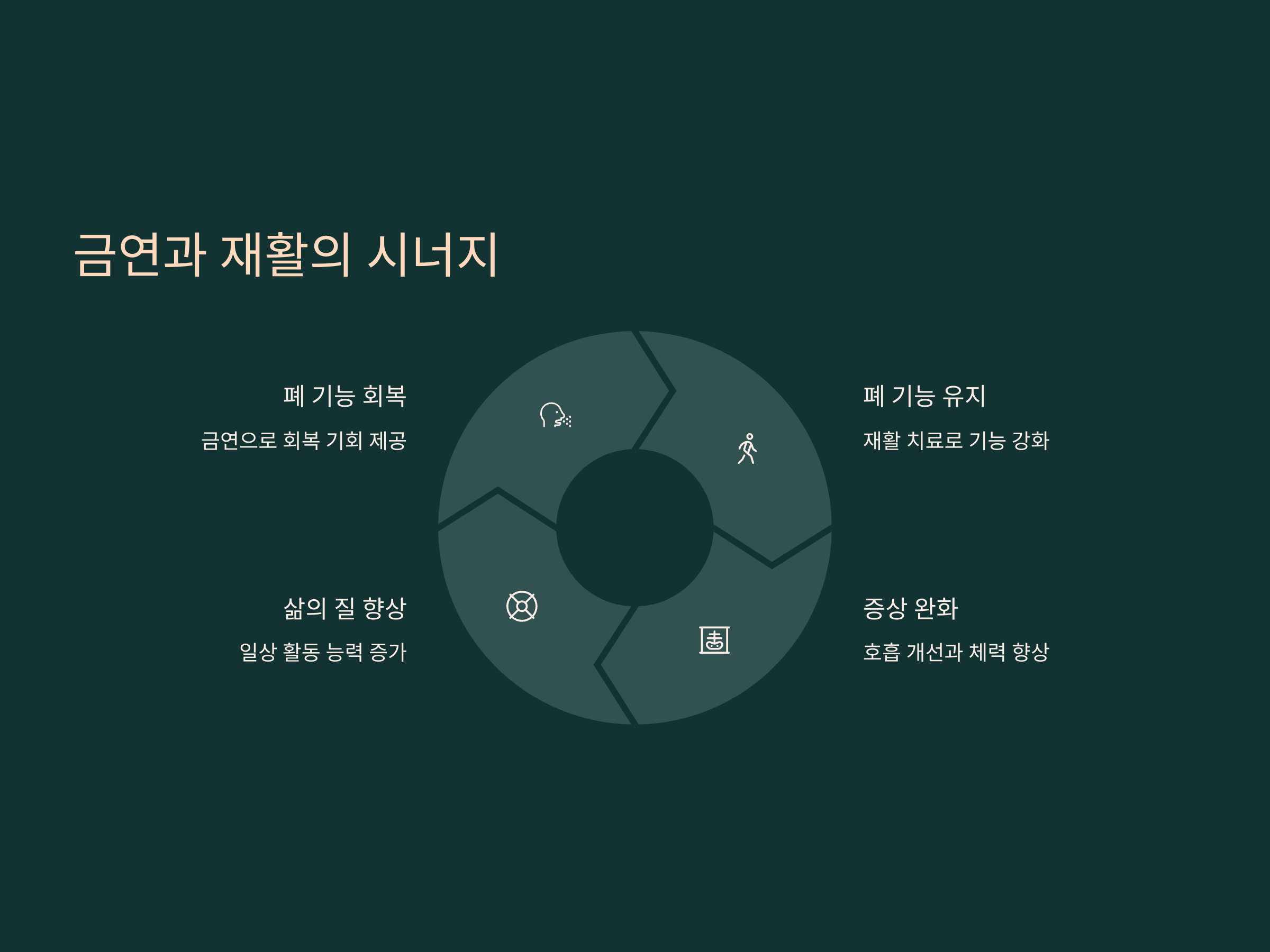 금연과 폐 재활 치료를 병행하면 폐기종을 개선하는 데 시너지 효과를 얻을 수 있습니다. 금연을 통해 폐 기능이 회복될 수 있는 기회를 제공하며, 폐 재활 치료를 통해 폐 기능을 유지하고 증상을 완화시킬 수 있습니다. 이 두 가지 치료법은 독립적으로 작용하기보다는 서로 보완적으로 작용하여, 폐기종의 악화를 예방하고 증상을 완화하는 데 큰 도움이 됩니다.