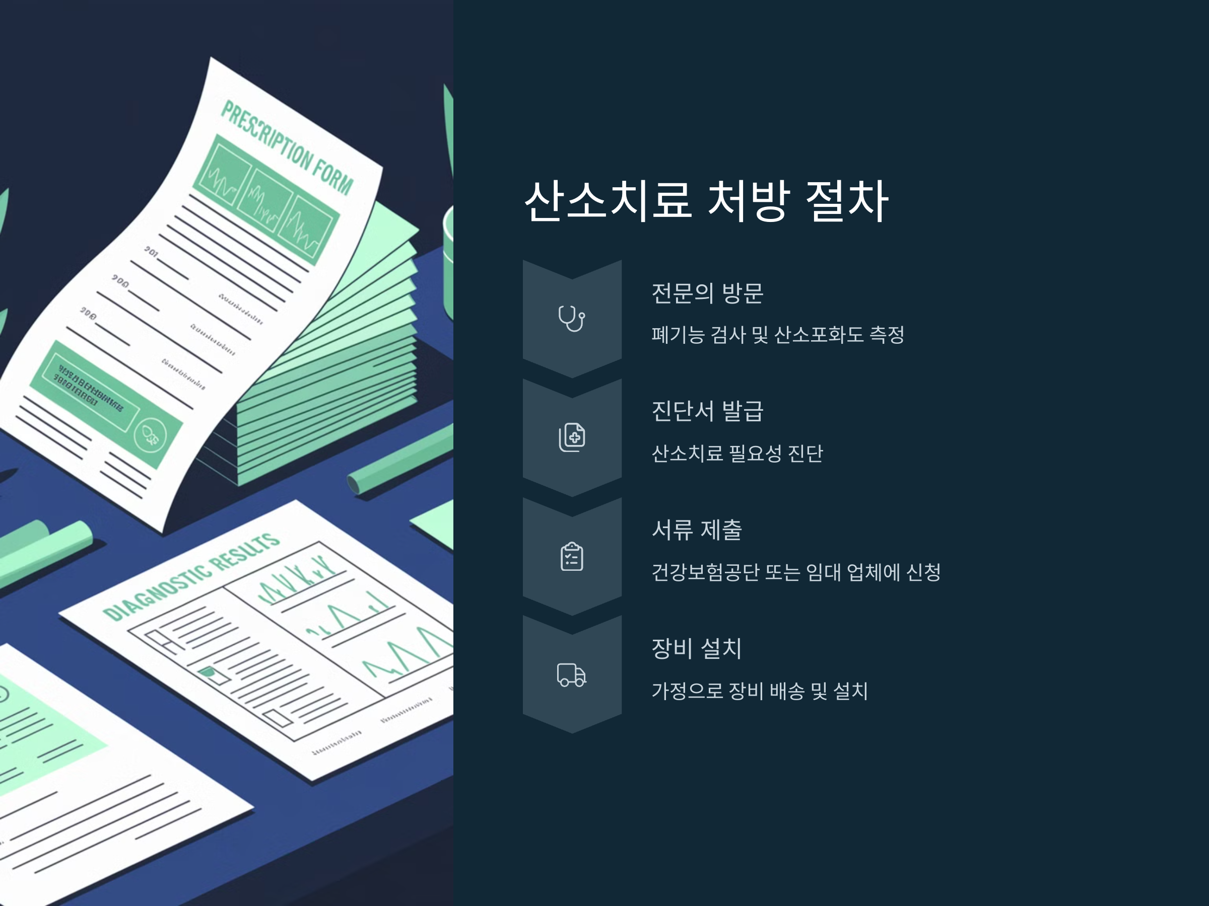 산소 발생기를 건강보험 급여로 임대하기 위해서는 정확한 절차를 따라야 합니다. 우선 호흡기 내과 또는 가정의학과 전문의를 방문해 폐기능 검사 및 산소포화도 측정을 받습니다. SpO2가 88% 이하이거나 FEV1 수치가 기준 이하인 경우, 해당 의사가 산소치료 필요성 진단서를 발급하게 됩니다. 이 진단서와 함께 처방전, 검사 결과지를 준비하여 건강보험공단에 제출하거나, 산소 발생기 임대 업체에 전달하여 심사를 요청합니다.