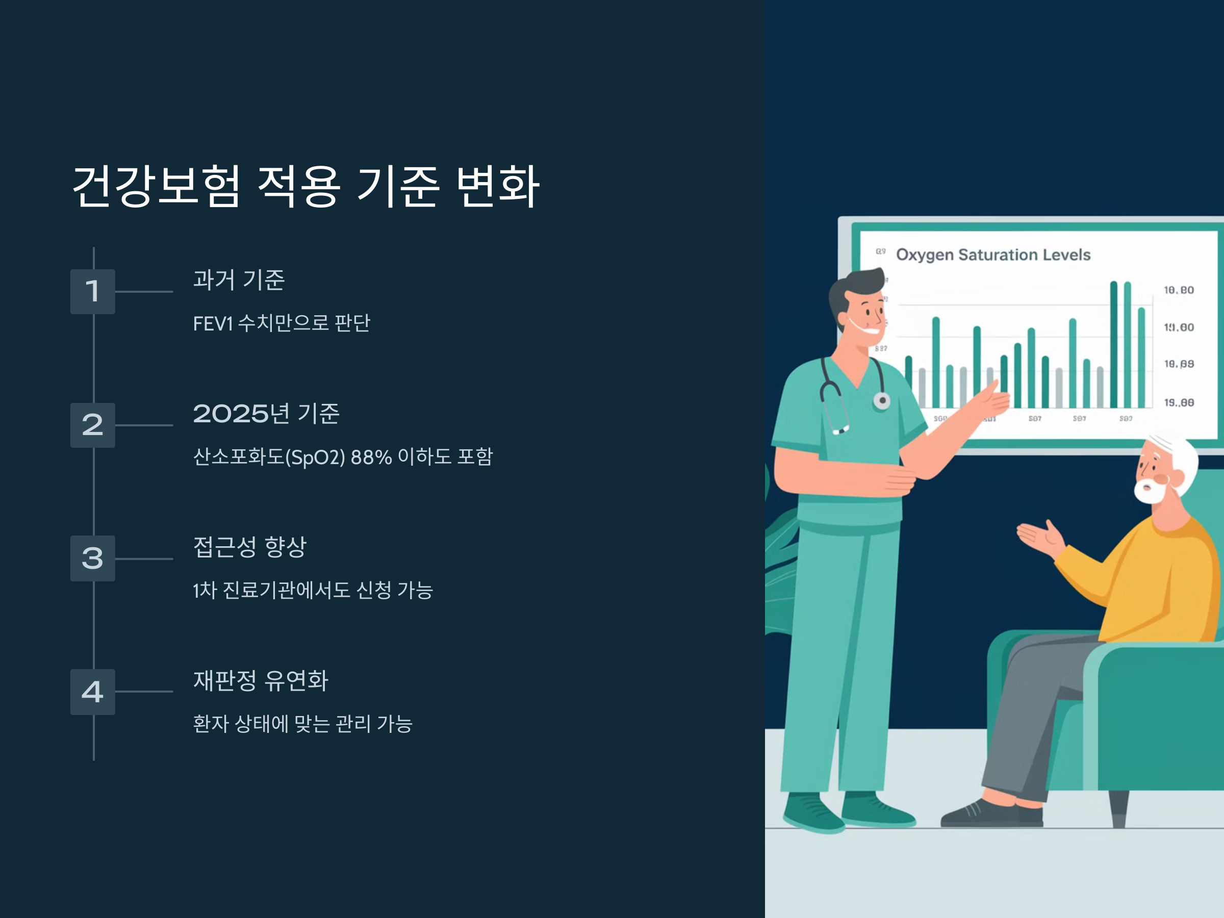2025년부터 시행되는 변경된 건강보험 기준은 환자의 접근성과 편의성을 크게 높였습니다. 기존에는 FEV1 수치만으로 산소치료 필요성을 판단했지만, 현재는 산소포화도 수치도 주요 기준으로 포함됩니다. SpO2 수치가 안정 시 88% 이하일 경우 산소치료가 필요한 환자로 분류되어 건강보험 급여 대상이 되며, 병원에서 검사 후 전문의의 진단 하에 산소 발생기 처방이 가능합니다.