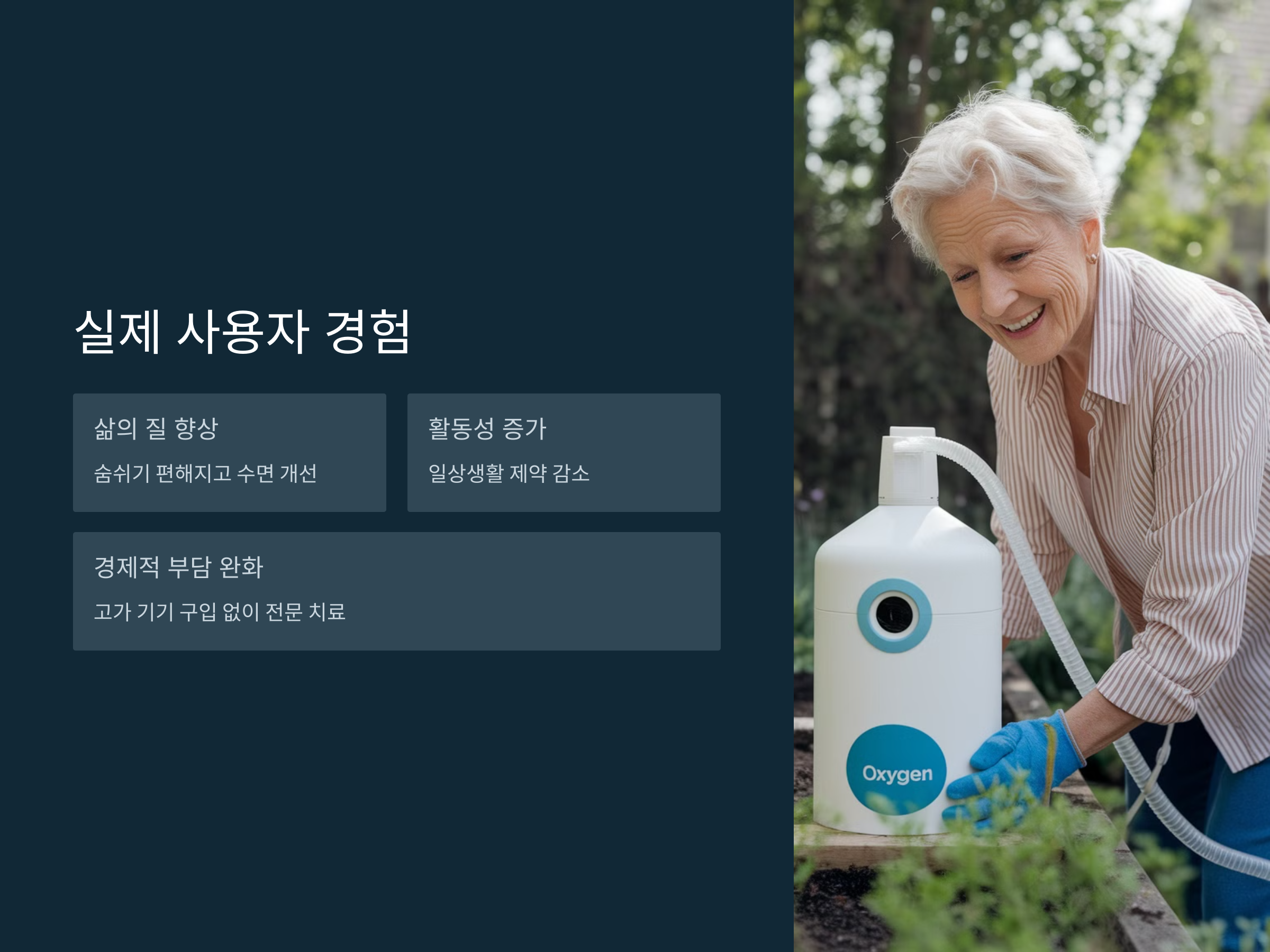 또한, 임대 방식의 접근성이 높아져 고가의 기기를 구입하지 않고도 전문적인 산소치료를 받을 수 있어 경제적 부담이 크게 완화됩니다. 사용자 인터뷰에 따르면, 산소 발생기와 산소 포화도 측정기(Oximeter)를 함께 사용하는 것이 치료 관리에 유리하며, 가족이 직접 기기 작동법을 숙지하는 것도 필수로 언급됩니다.