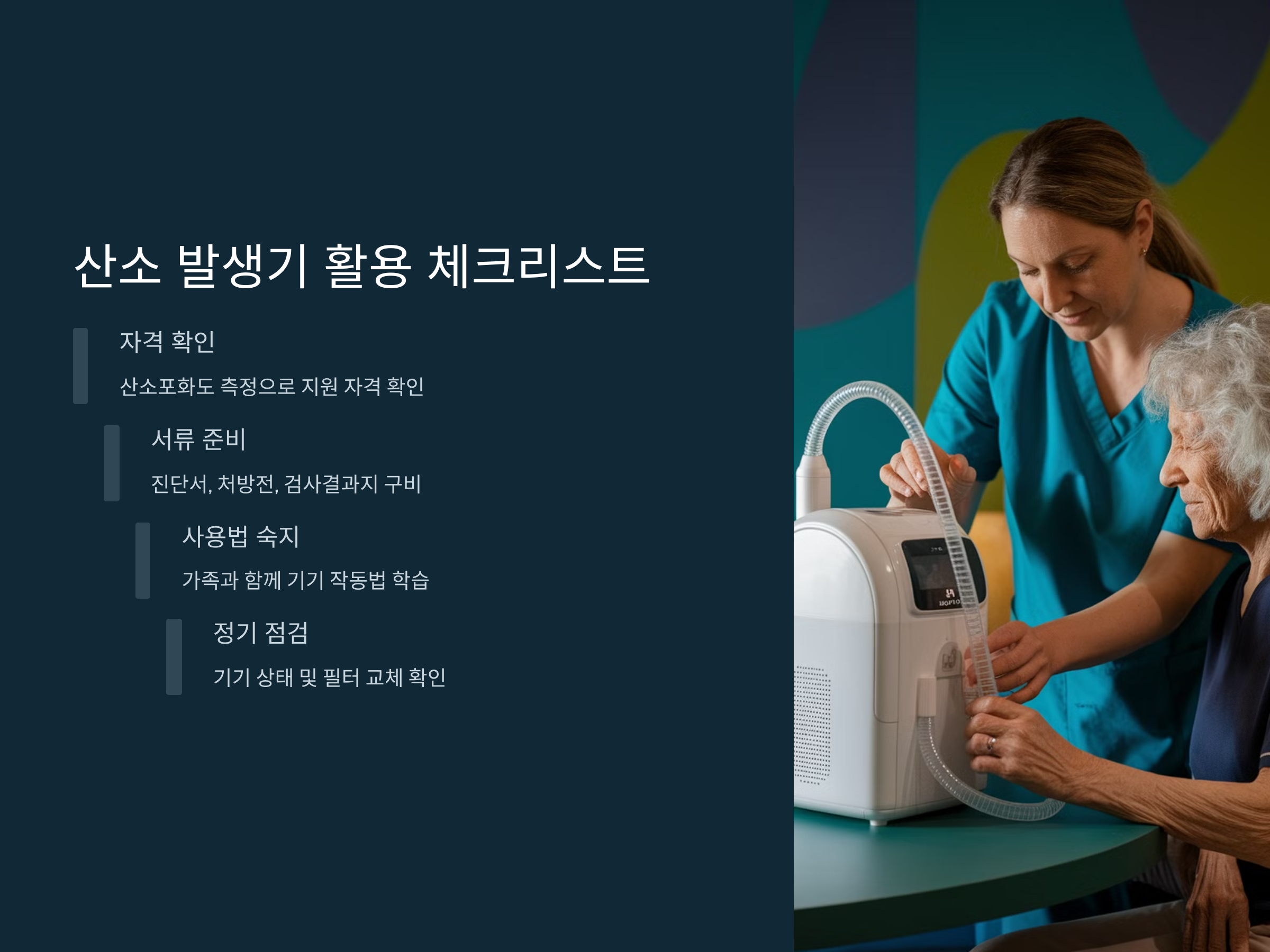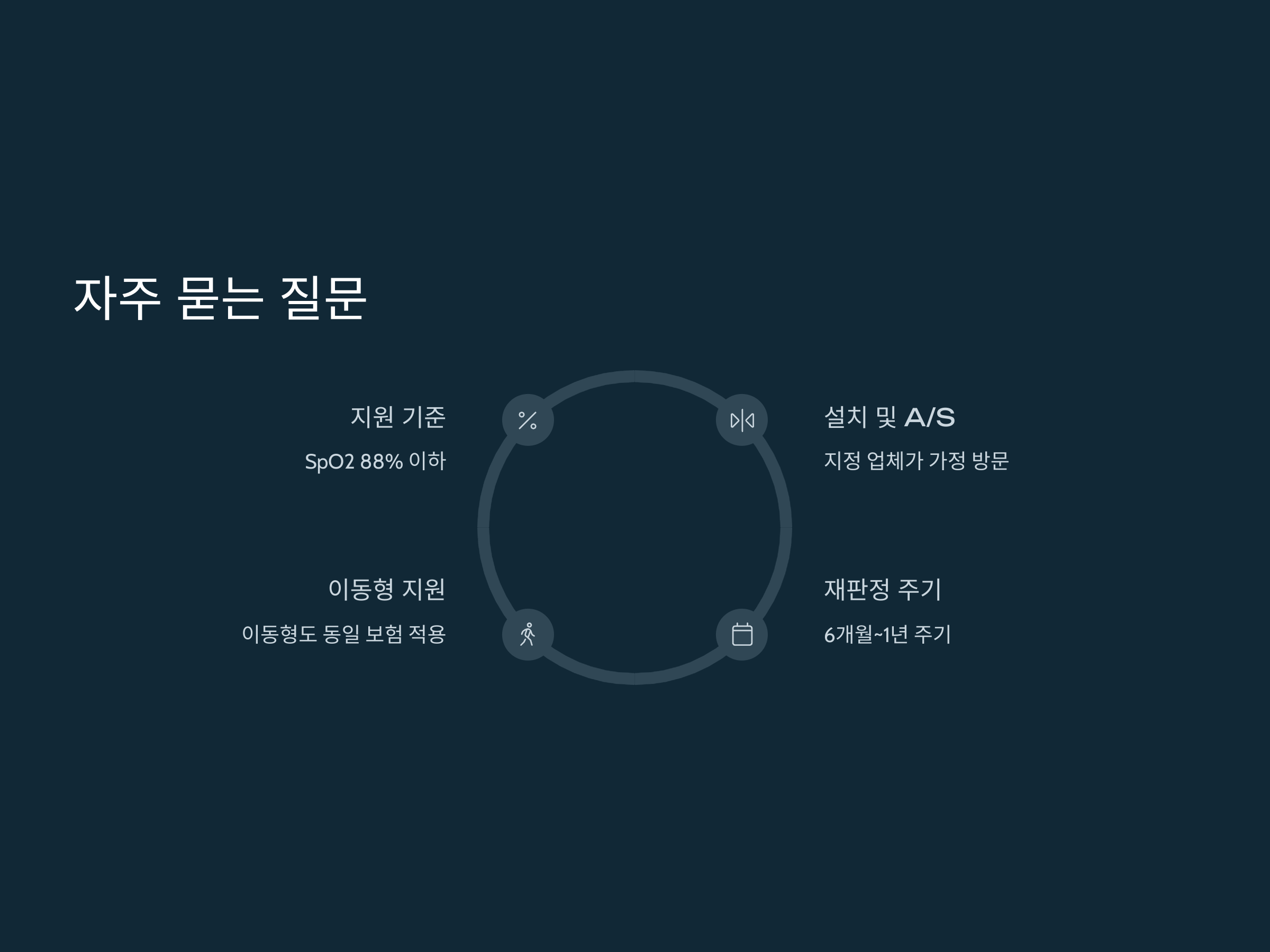 정상적으로 승인될 경우, 지정된 산소 발생기 업체에서 가정으로 장비를 설치하며, 환자는 일정 주기마다 장비 점검 및 재판정을 통해 지속적인 혜택을 받을 수 있습니다. 중간에 건강 상태가 호전되어 치료 중단이 필요한 경우에도 의사의 재평가를 통해 유연하게 관리가 가능합니다.