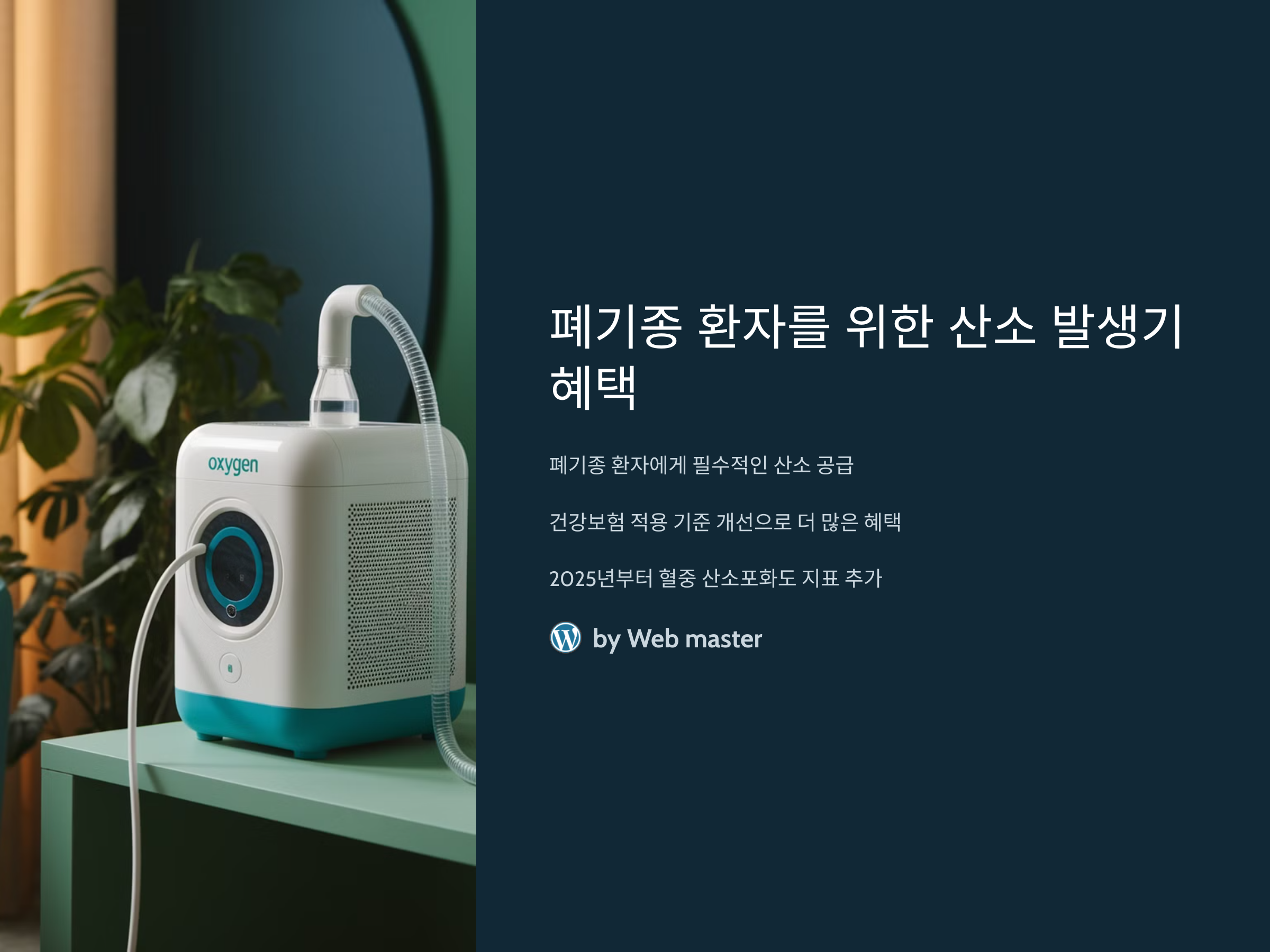 폐기종은 만성폐쇄성폐질환(COPD)의 대표적인 질환으로, 산소 공급이 필수적인 경우가 많습니다. 최근 건강보험심사평가원과 국민건강보험공단은 산소 발생기 사용에 대한 건강보험 적용 기준을 개선하고, 장기 임대 및 사용에 대한 제도를 보다 명확히 하였습니다. 2025년부터는 폐기능 평가 지표인 FEV1 수치 기준 외에도 혈중 산소포화도(SpO2) 지표가 보완 기준으로 추가되어 보다 많은 환자들이 혜택을 받을 수 있게 되었으며, 특히 1차 진료기관에서도 신청이 가능하도록 간소화된 절차가 도입되었습니다. 본 글에서는 폐기종 환자분들이 꼭 알아야 할 산소 발생기 건강보험 적용 조건, 임대 지원 제도, 신청 절차부터 실질적인 비용 혜택까지 A부터 Z까지 정리해 드립니다. 특히 ‘산소치료 필요 판정’ 후 얼마나 빠르게 지원받을 수 있는지, 어떤 서류가 필요한지, 환자와 보호자가 겪을 수 있는 실질적인 경험을 바탕으로 설명합니다. 이 글을 통해 폐기종 환자 및 가족분들이 더 빠르고 확실하게 제도의 혜택을 누릴 수 있도록 돕겠습니다.