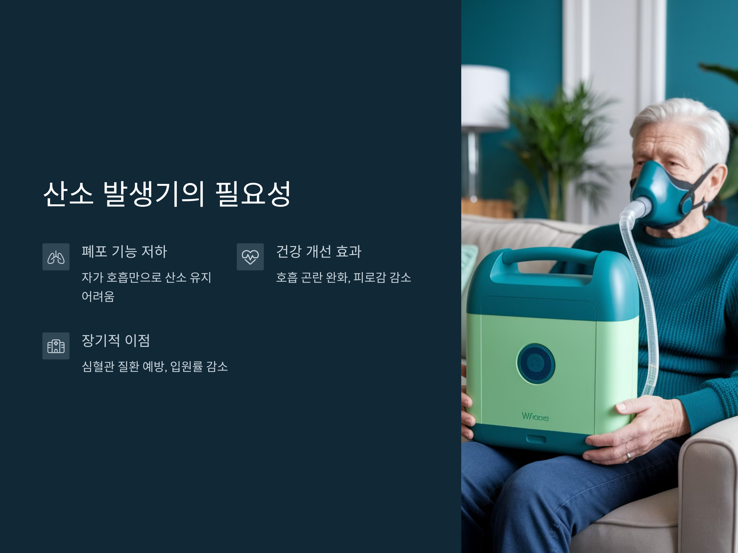 특히 산소치료는 단기적 효과 외에도 심혈관계 질환 예방, 입원률 감소, 삶의 질 향상이라는 중대한 이점을 제공합니다. 산소포화도가 88% 이하로 떨어지는 경우, 산소치료는 더 이상 선택이 아닌 필수가 되며, 의료진 판단 하에 산소 발생기를 처방받을 수 있습니다. 최근에는 가정용 이동식 산소 발생기도 보편화되면서 일상생활의 제약 없이 치료를 병행할 수 있는 환경이 마련되고 있습니다.