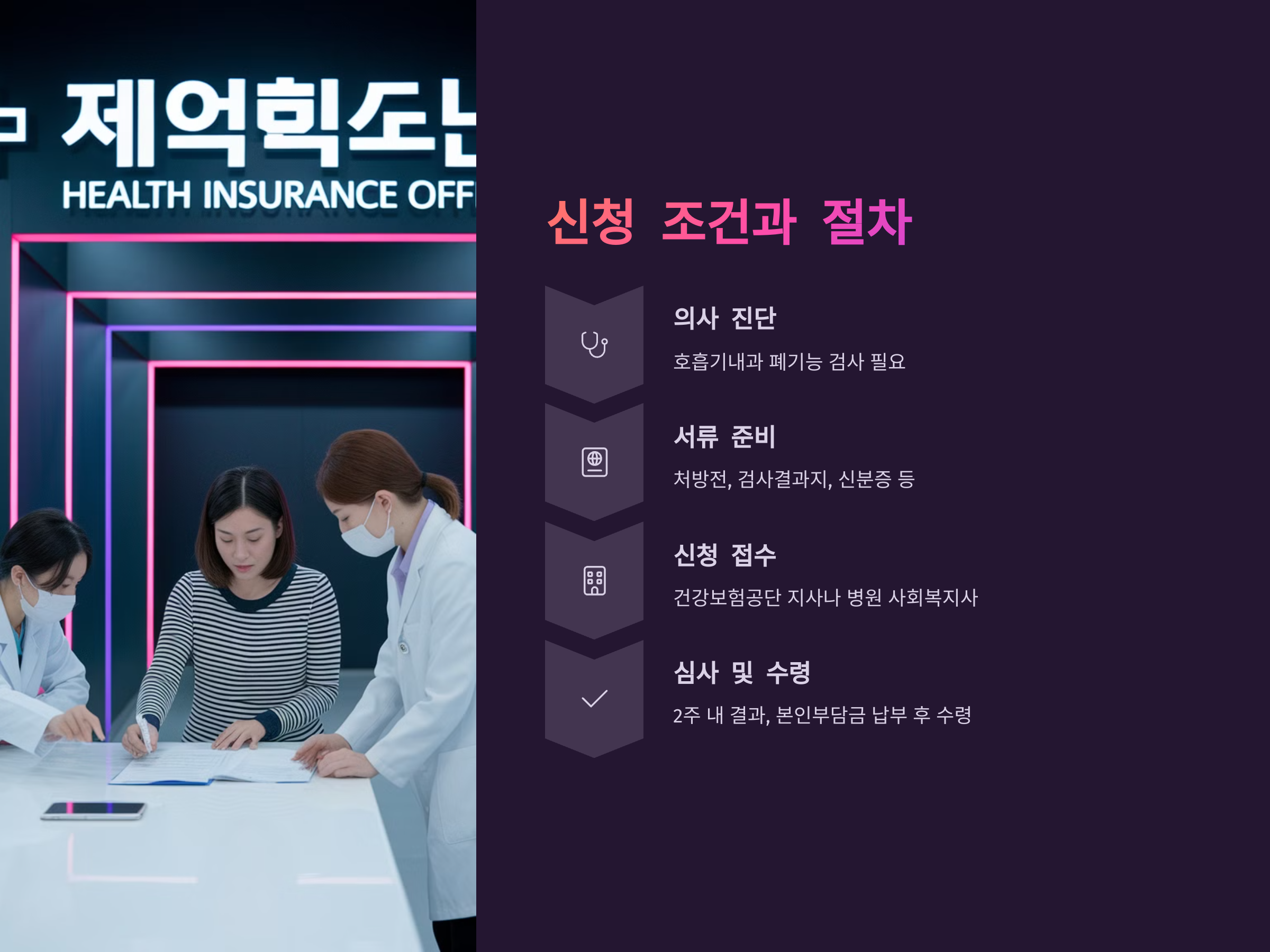 주요 필요서류는 다음과 같습니다: ① 주치의의 처방전, ② 폐기능검사 결과지, ③ 환자 신분증 사본, ④ 건강보험증 또는 의료급여증, ⑤ 기기 선택 신청서. 접수는 가까운 국민건강보험공단 지사나 병원 내 사회복지사와 연계해 진행할 수 있습니다. 이후 2주 이내 결과 통보가 되며, 본인 부담금 납부 후 장비를 수령하게 됩니다.