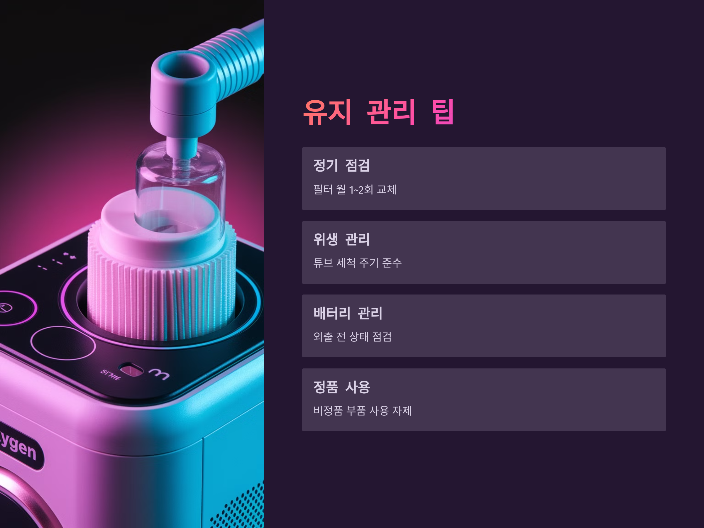 산소발생기 사용 시에는 정기적인 유지보수와 위생 관리가 필수입니다. 필터는 월 1~2회 이상 교체해야 하며, 습도 조절기 및 산소 연결 튜브는 세척과 교환 주기를 철저히 지켜야 감염을 예방할 수 있습니다. 특히 여름철에는 장시간 외출 시 장비 과열 문제를 방지해야 하며, 배터리 상태를 사전 점검하는 습관을 길러야 합니다.