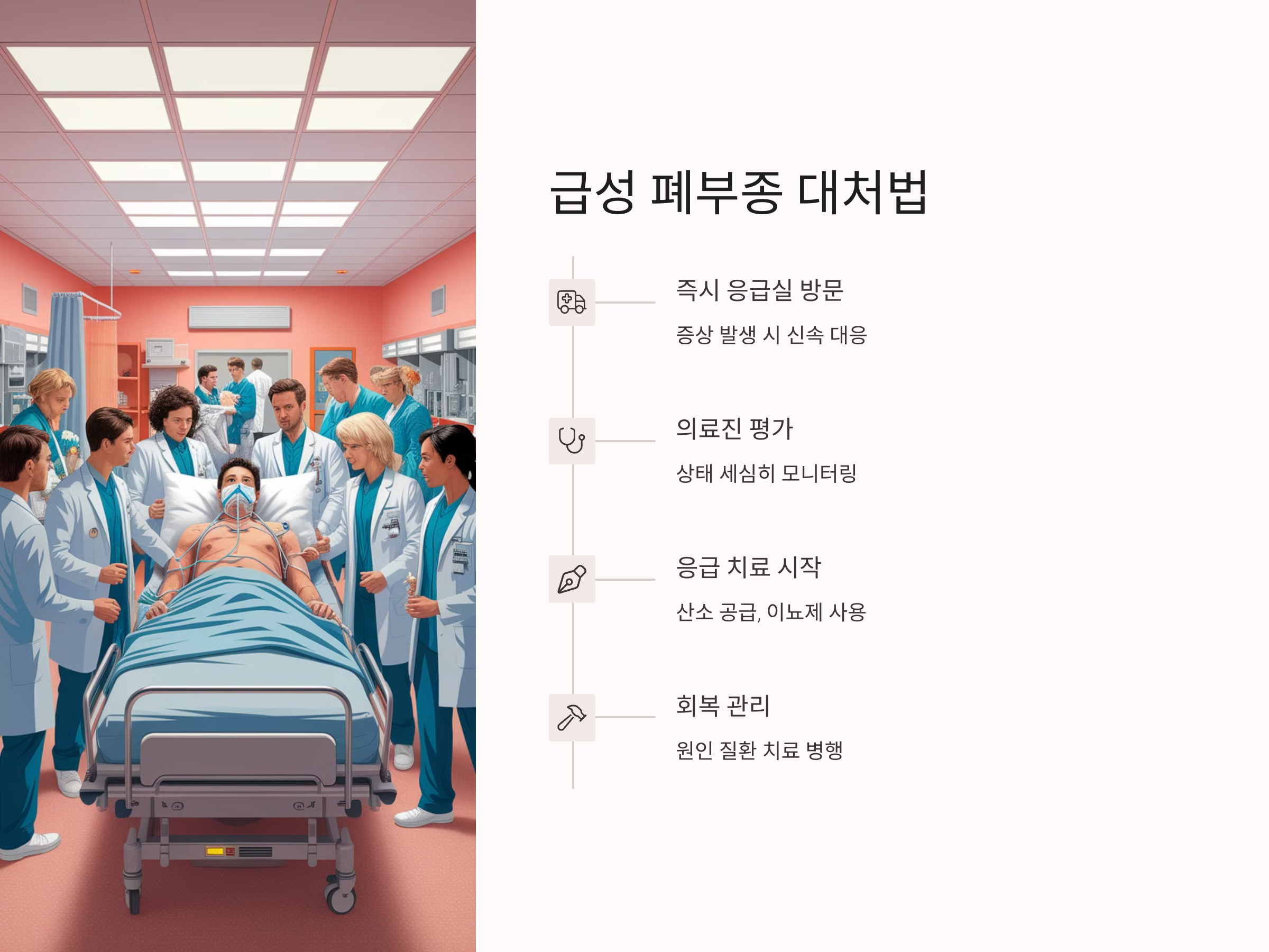 급성 폐부종은 매우 빠르게 진행되는 상태로, 즉각적인 응급 처치가 필요합니다. 증상이 나타나면 즉시 응급실로 가야 하며, 거품 섞인 가래나 심한 호흡 곤란이 동반되면 더욱 빠른 대처가 요구됩니다. 응급처치로는 산소 공급과 이뇨제 사용 등이 있으며, 이 과정에서 의료진은 환자의 상태를 세심하게 모니터링합니다.