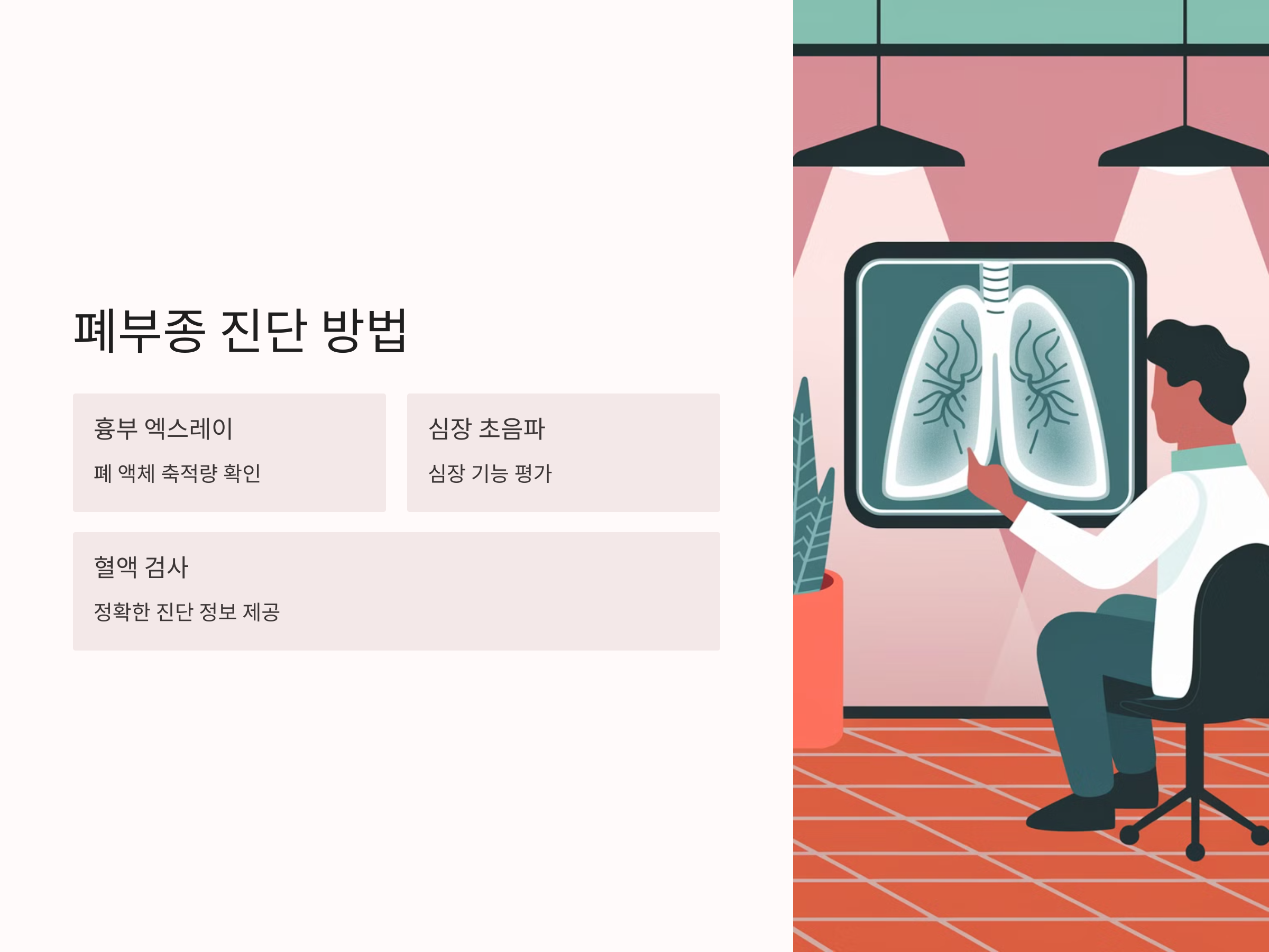 폐부종의 진단은 일반적으로 환자의 증상, 신체 검사 및 다양한 검사들을 통해 이루어집니다. 가장 중요한 진단 도구 중 하나는 흉부 엑스레이로, 이를 통해 폐에 축적된 액체의 양을 확인할 수 있습니다. 또한, 심장 초음파와 혈액 검사도 폐부종을 정확히 진단하는 데 유용한 정보를 제공합니다.