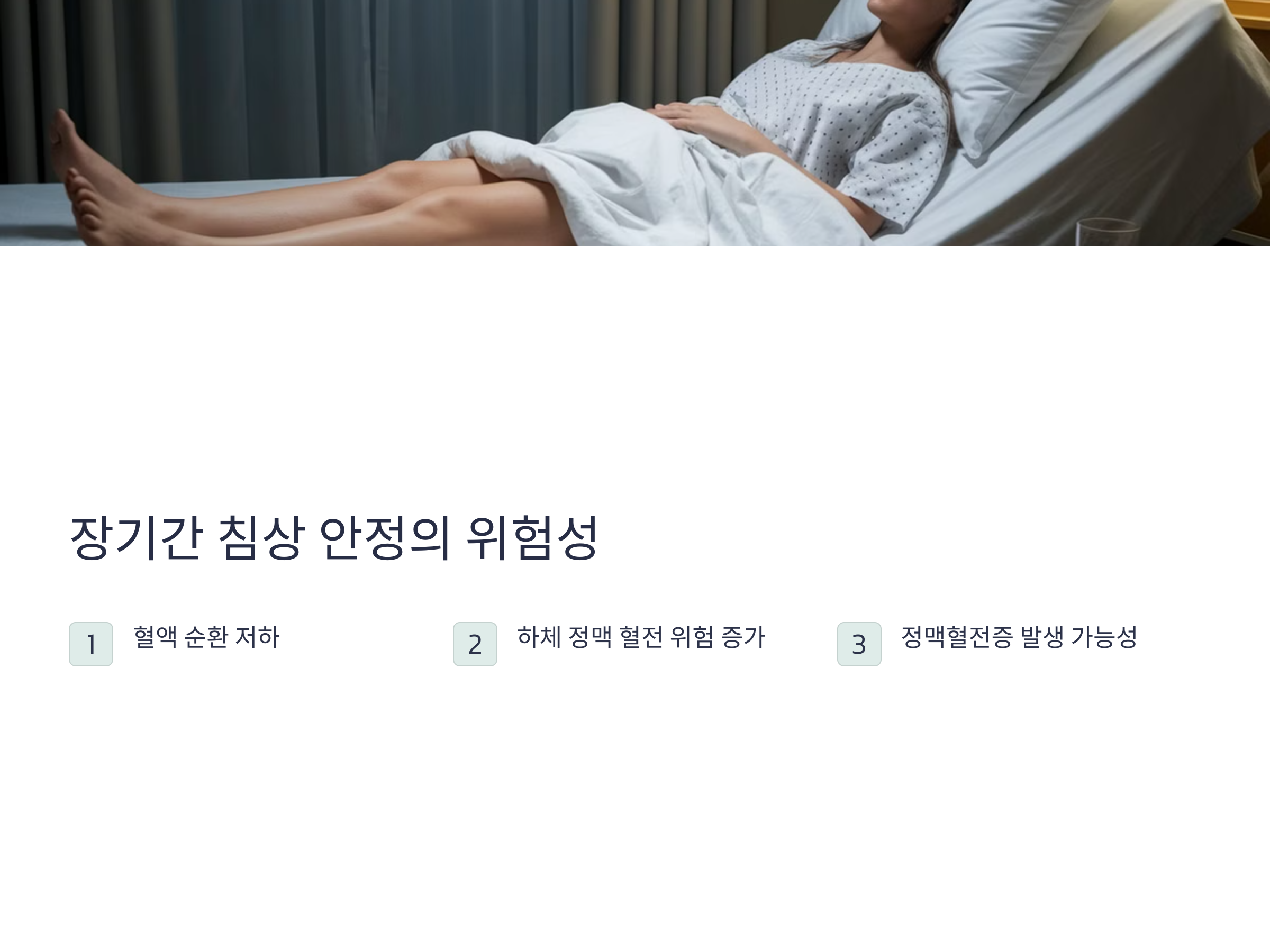침상 안정이 길어질수록 근육의 활동이 부족해지며, 혈액이 순환하지 않기 때문에 혈전이 형성될 수 있습니다. 이로 인해 혈액이 정상적으로 흐르지 않으며, 혈전이 발생하는 환경이 조성됩니다. 이러한 경우, 대개 환자는 수술 후 회복기간 동안 침대에 누워 있는 경우가 많고, 심지어 장기간 병원에 입원해 있는 환자들도 이 문제에 노출될 수 있습니다. 따라서, 장기간 침상 안정을 유지할 때는 적절한 예방 조치를 취하는 것이 중요합니다.
