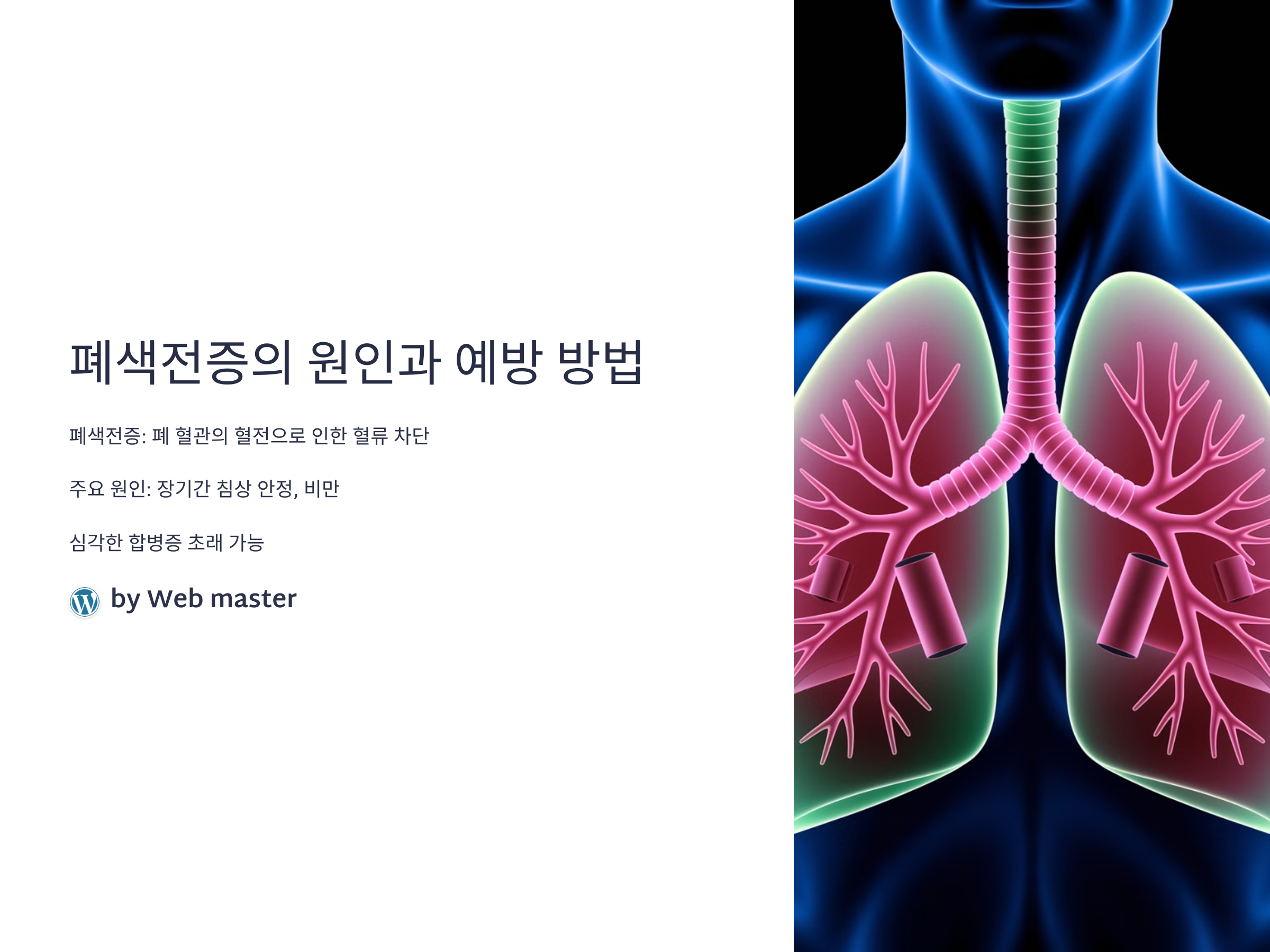 폐색전증은 장기적인 침상 안정과 비만 등 여러 원인에 의해 발생할 수 있습니다. 이를 예방하려면 규칙적인 운동과 건강한 식습관을 유지해야 합니다.