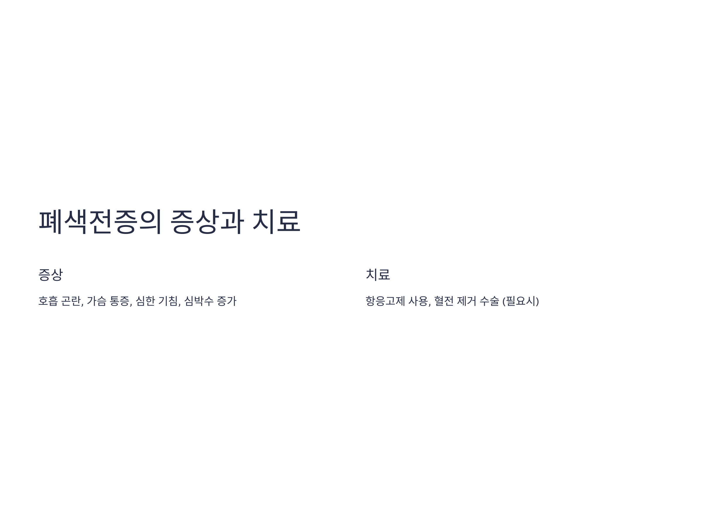 폐색전증은 갑작스럽고 심각한 증상을 동반할 수 있습니다. 증상으로는 호흡 곤란, 가슴 통증, 심한 기침, 심박수 증가 등이 나타날 수 있습니다. 증상이 나타나면 즉시 의료기관을 방문하여 치료를 받아야 합니다.