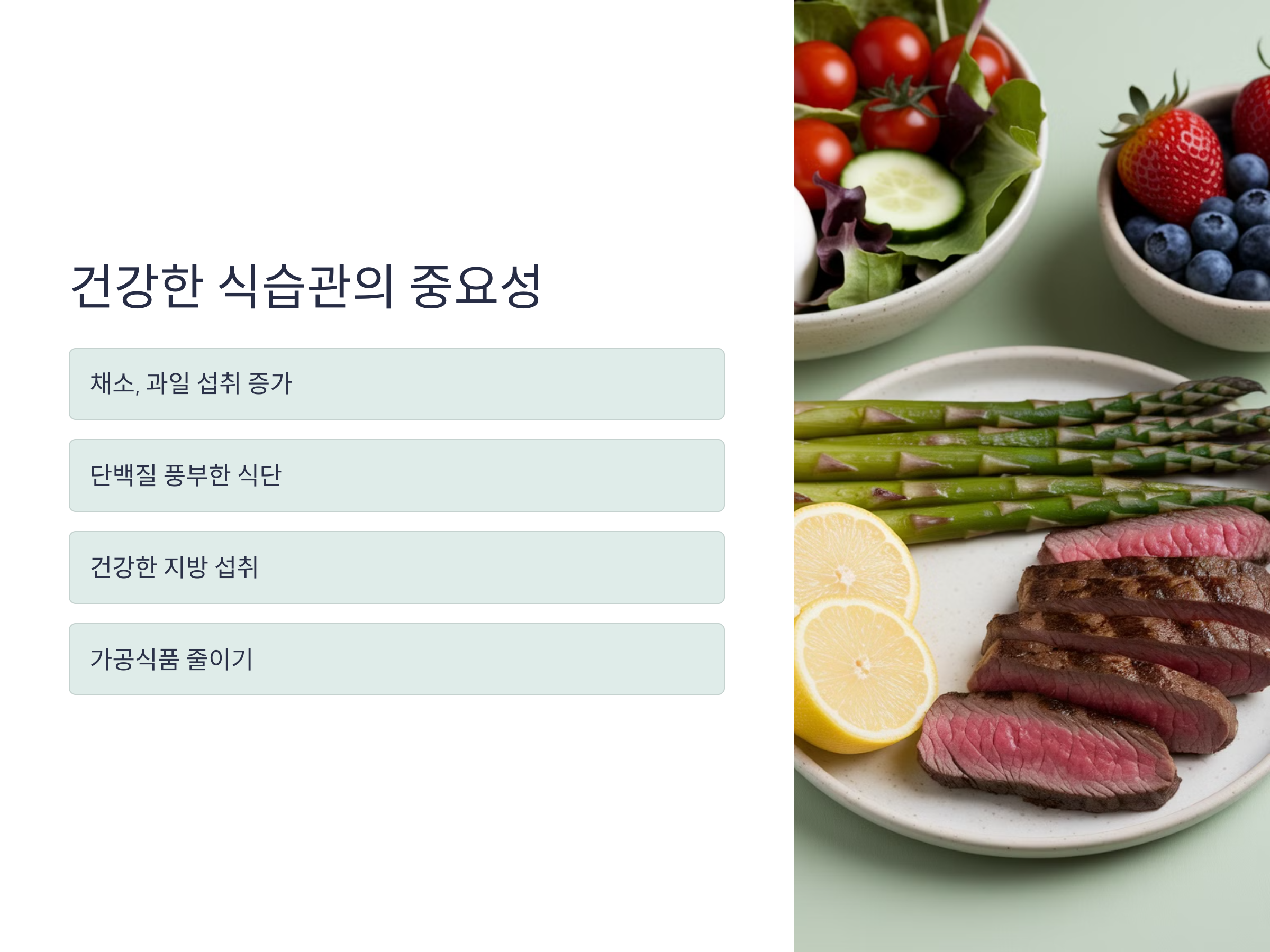 비만을 예방하기 위해서는 균형 잡힌 식습관이 필요합니다. 체중을 조절하려면 고칼로리 음식을 피하고, 채소, 과일, 단백질이 풍부한 식단을 유지해야 합니다. 또한, 지방이 적고 건강한 지방(예: 올리브유, 아보카도 등)을 섭취하는 것이 중요합니다. 정제된 탄수화물이나 설탕의 섭취를 줄이고, 가공된 음식보다는 자연식품을 중심으로 식사하는 것이 건강한 체중 관리에 도움이 됩니다.