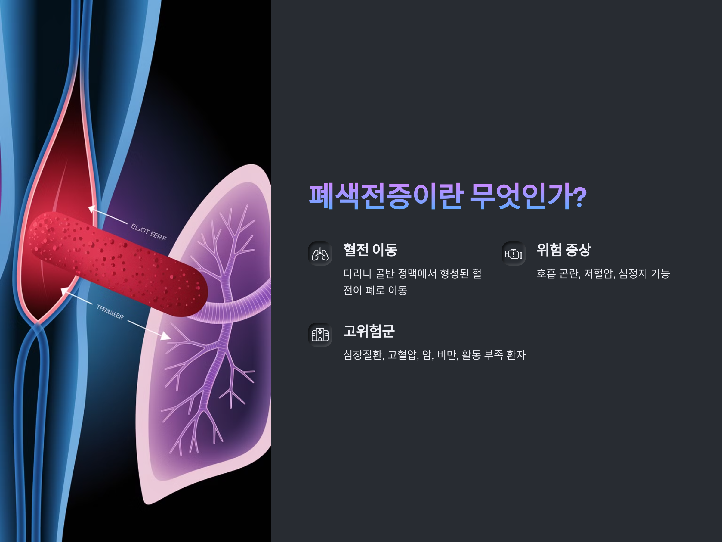 폐색전증은 혈전이 대개 다리나 골반의 정맥에서 형성되어 혈류를 통해 폐로 이동하면서 발생합니다. 이 혈전이 폐동맥을 막으면 폐에 혈액이 공급되지 않아 심각한 호흡 곤란, 저혈압 및 심정지 등의 증상이 나타날 수 있습니다. 폐색전증은 빠르게 진단하지 않으면 생명을 위협하는 상태로 발전할 수 있습니다.