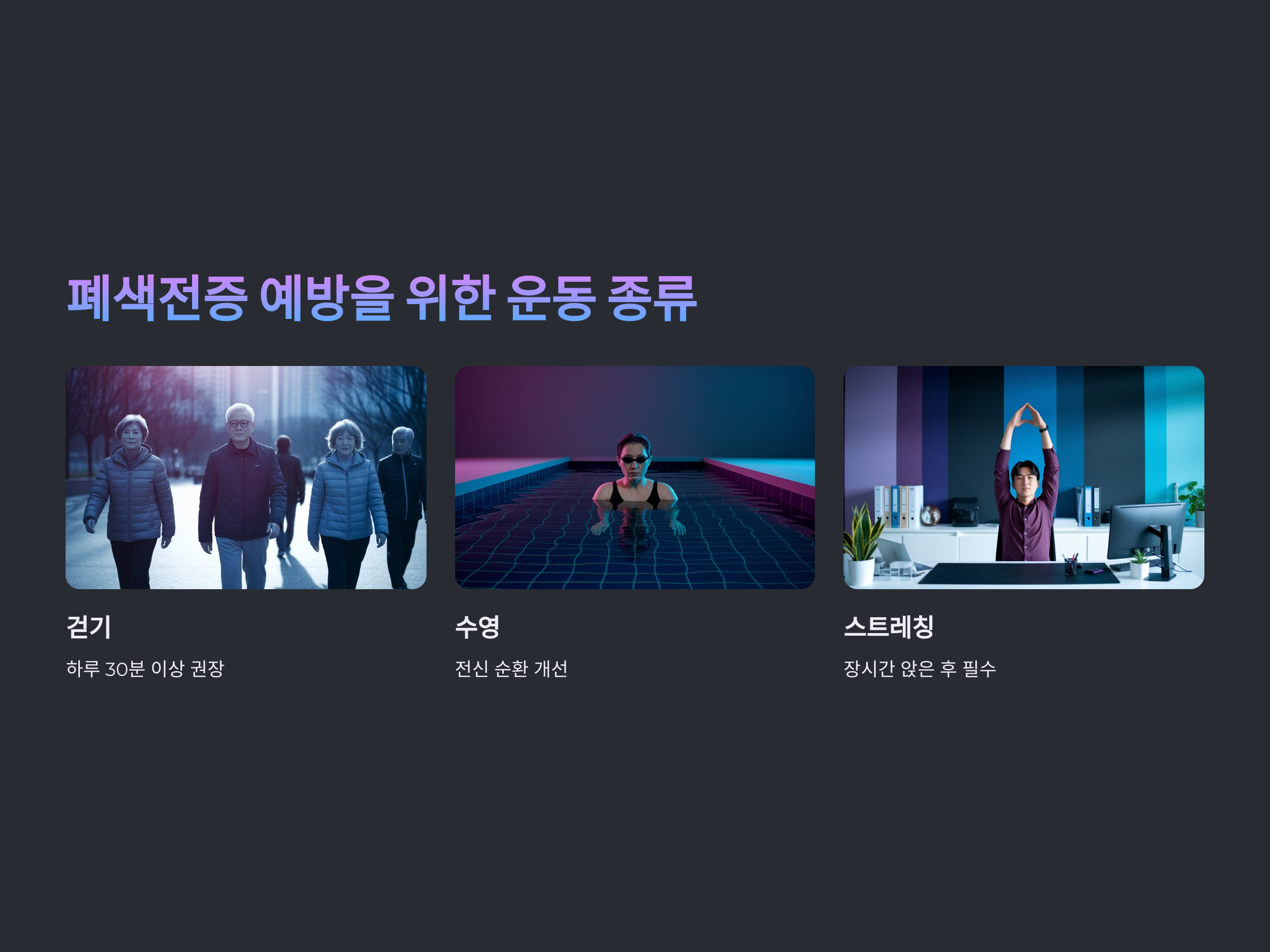 폐색전증 예방을 위한 운동은 너무 격렬하지 않고 일상에서 쉽게 실천할 수 있는 운동이 좋습니다. 대표적인 운동은 걷기, 자전거 타기, 수영 등이 있으며, 이러한 운동은 혈액 순환을 촉진하고, 다리 근육을 강화하는 데 효과적입니다. 하루에 30분 이상 지속적인 운동을 하는 것이 바람직합니다.