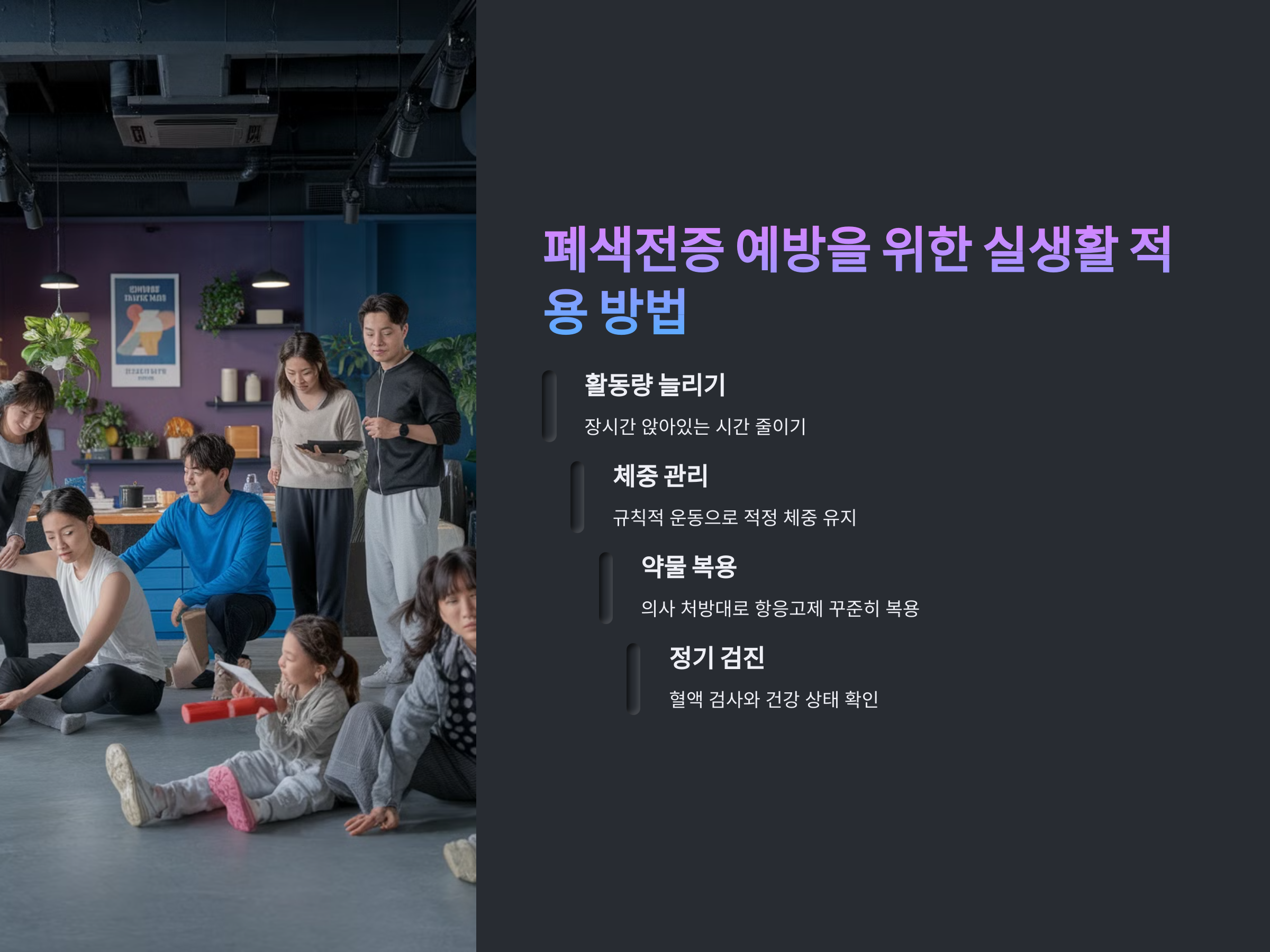 폐색전증 예방을 위한 실생활에서의 적용 방법은 간단하지만 매우 중요합니다. 첫째, 장시간 앉아 있는 시간을 줄이고, 자주 일어나서 걷거나 스트레칭을 하도록 합니다. 둘째, 적절한 체중을 유지하고, 규칙적인 운동을 통해 심혈관 건강을 챙깁니다. 셋째, 의사의 처방에 따라 항응고제를 꾸준히 복용하며, 정기적인 혈액 검사와 검진을 통해 상태를 확인합니다.