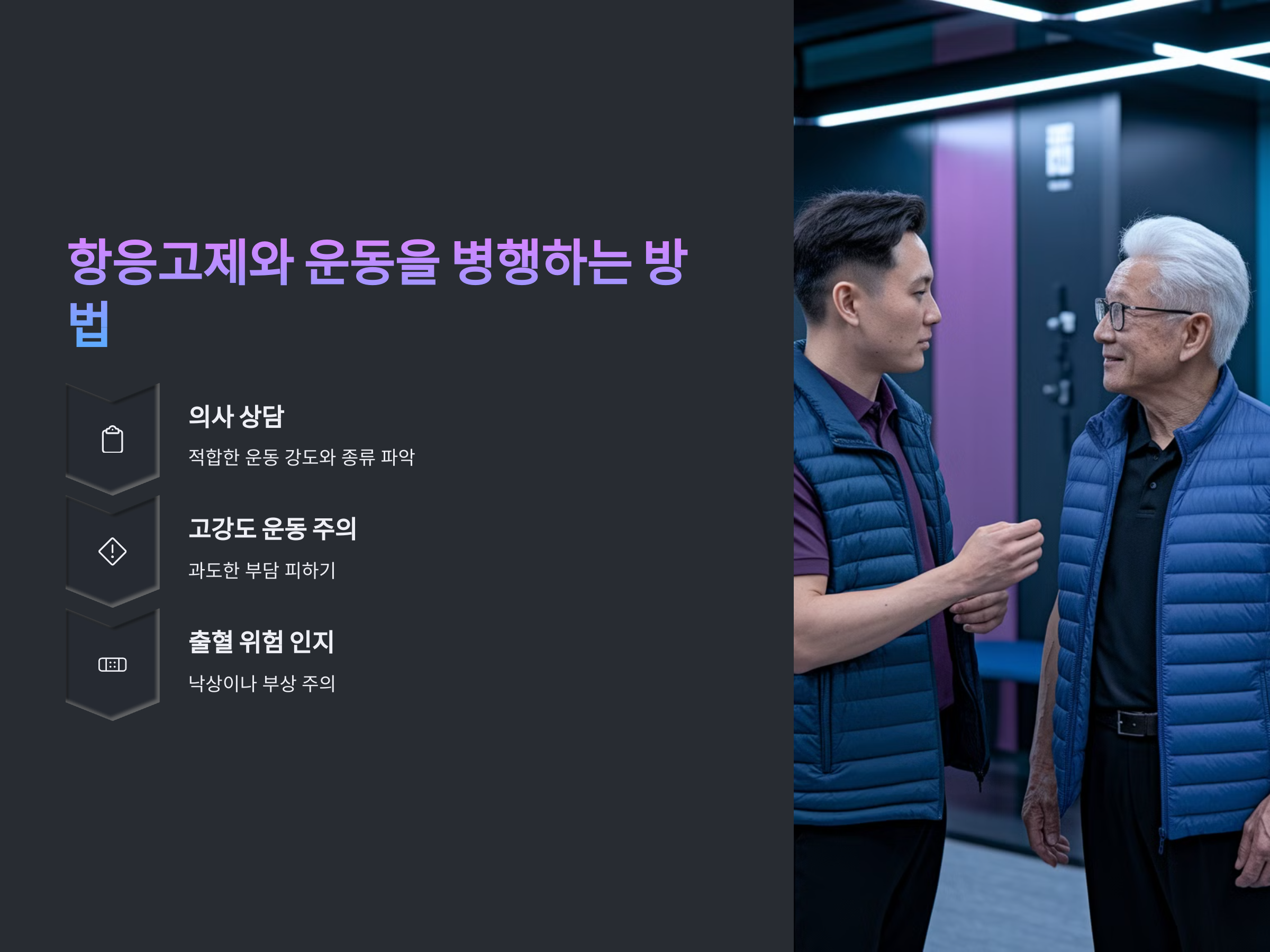 운동을 시작하기 전에 의사와 상담하여 자신에게 적합한 운동 강도와 종류를 파악하는 것이 중요합니다. 항응고제를 복용 중인 환자라면 낙상이나 다친 부위에서 출혈이 발생하지 않도록 주의하면서 운동을 해야 합니다.