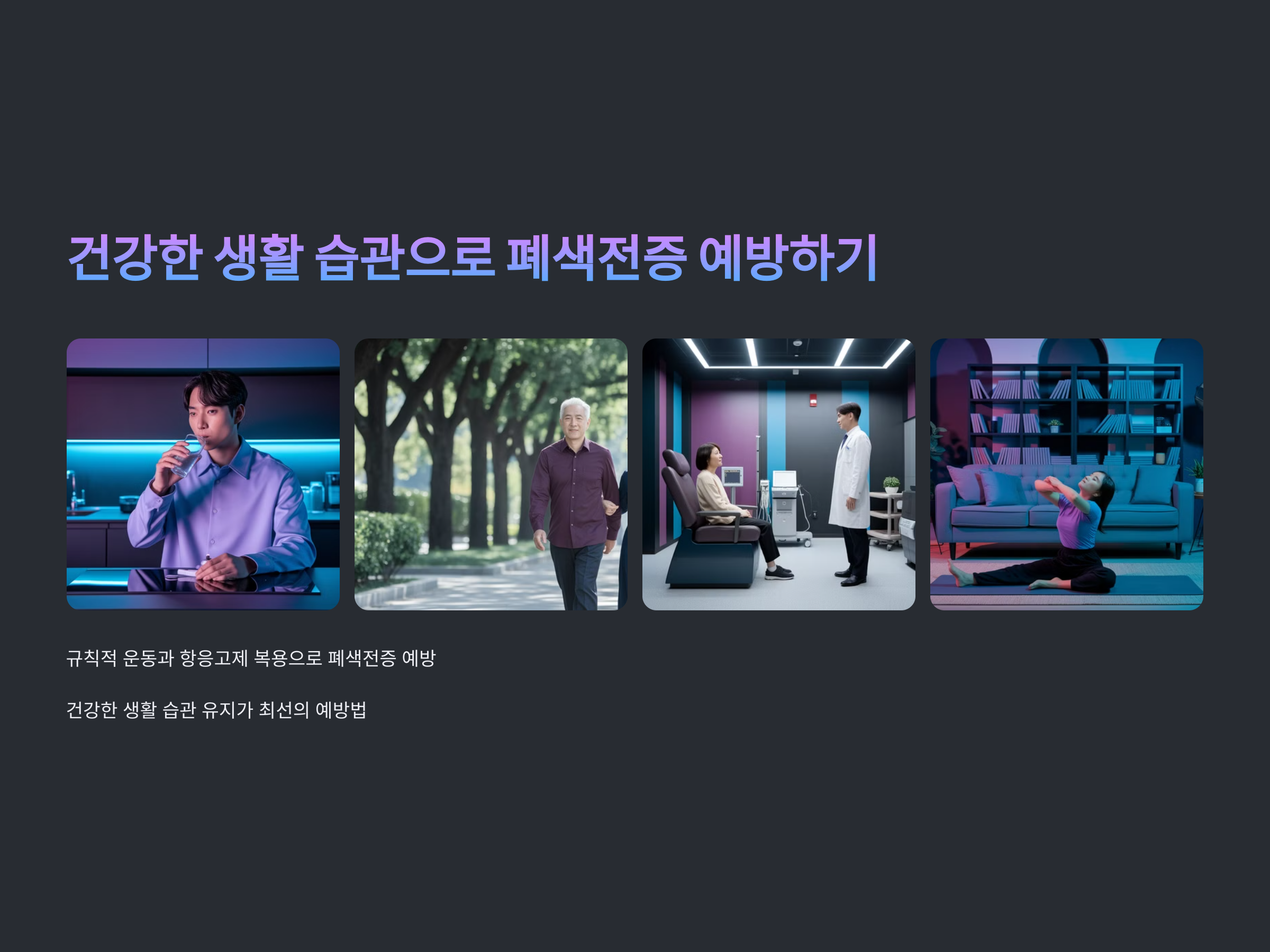 따라서 폐색전증 예방을 위해서는 생활 습관을 개선하는 것과 약물 치료를 병행하는 것이 중요합니다. 규칙적인 운동과 함께 건강한 생활 습관을 유지하면 폐색전증을 예방하고, 더 나은 건강을 유지할 수 있습니다.
