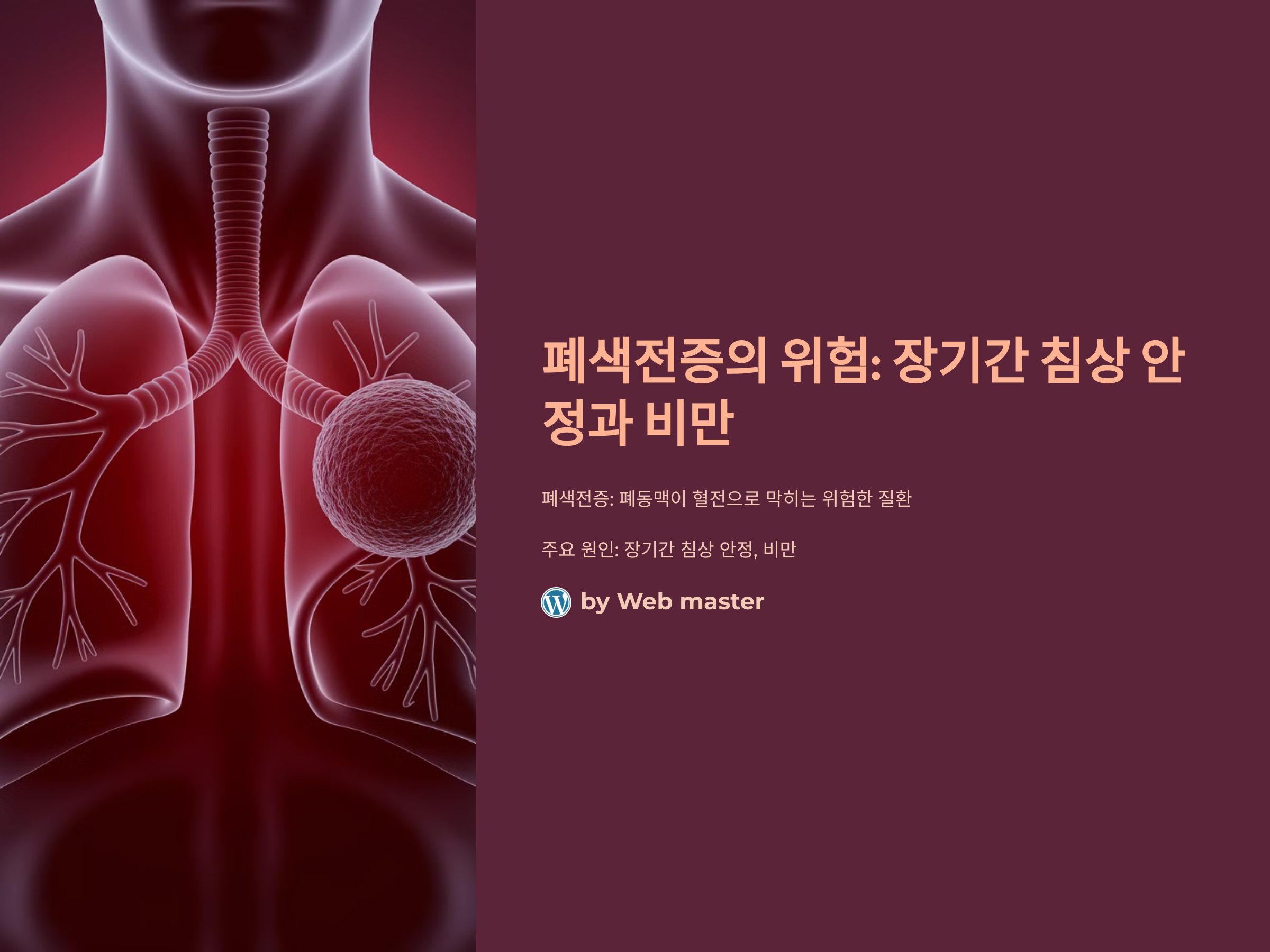 폐색전증(Pulmonary Embolism, PE)은 폐동맥이 혈전(피떡)으로 인해 막혀 혈류가 차단되는 질환입니다. 이 질환은 즉각적인 치료가 필요하며, 심한 경우 생명을 위협할 수 있습니다. 특히 장기간 침상 안정 및 비만은 주요 원인으로 꼽히며, 혈전 생성 위험을 크게 증가시킵니다.