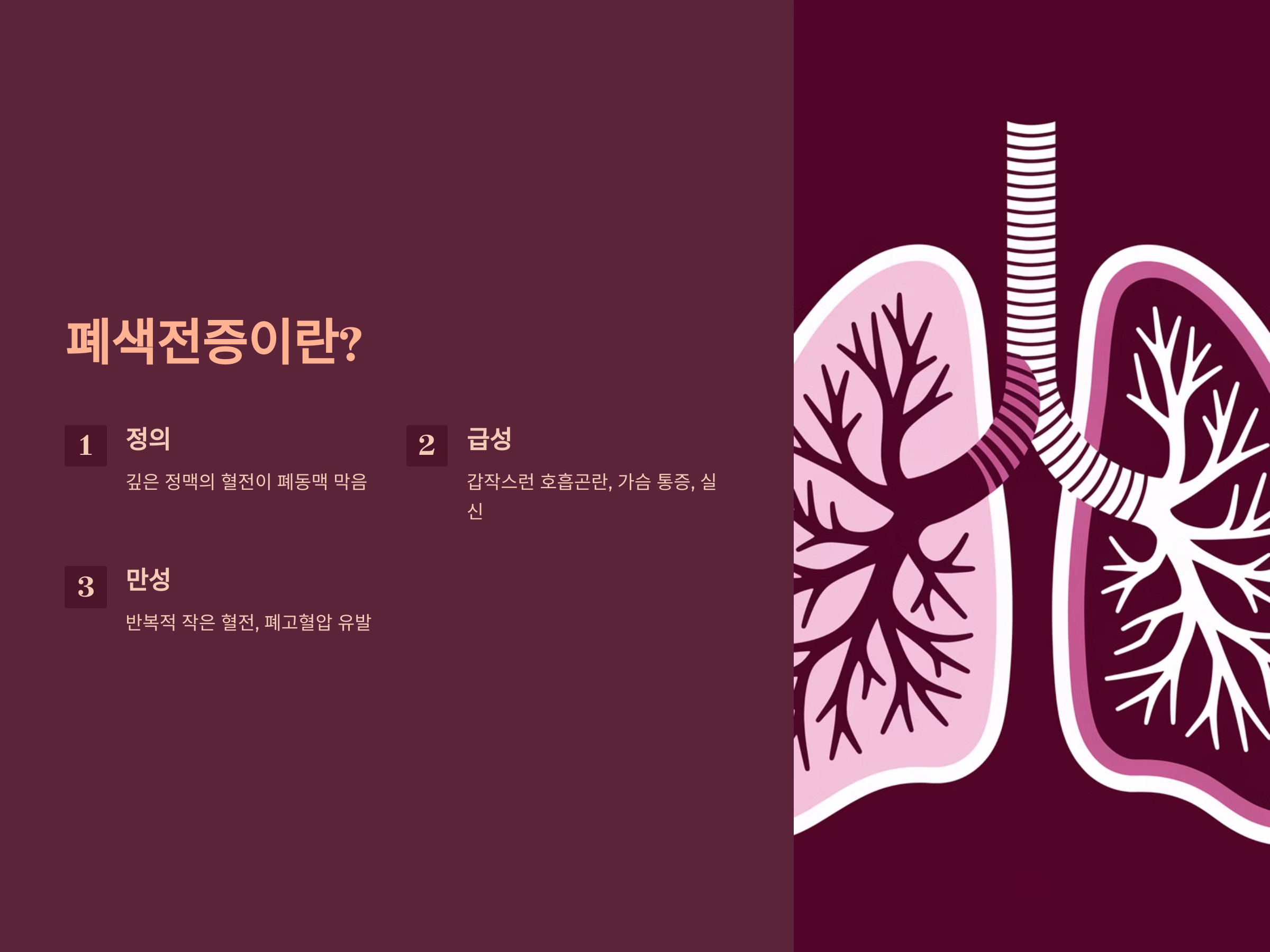 - 급성 폐색전증: 갑작스럽게 혈전이 폐동맥을 막아 심한 호흡곤란, 가슴 통증, 실신 등을 유발할 수 있음