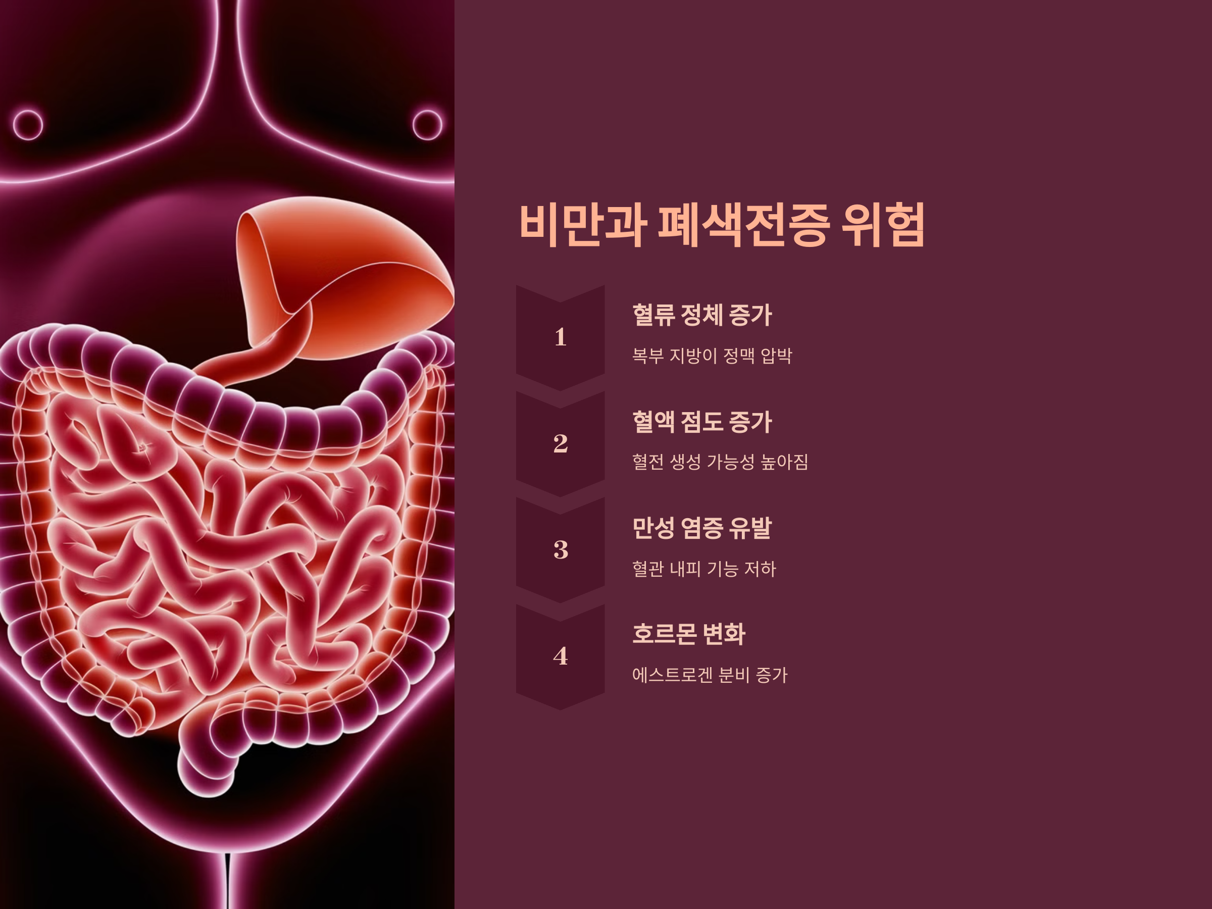 - 혈류 정체 증가: 복부 지방이 많을 경우 복부정맥을 압박하여 혈액 흐름을 방해