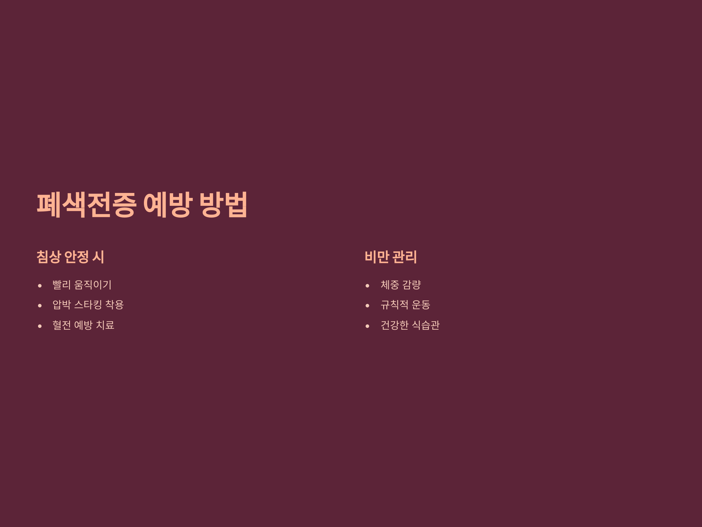 폐색전증은 조기에 발견하고 예방하는 것이 가장 중요합니다. 장기간 침상 안정이 필요한 경우 정기적으로 다리를 움직이거나 압박 스타킹을 사용하는 것이 혈전 예방에 도움이 됩니다. 또한, 비만한 경우 체중을 관리하고 혈액순환을 개선하는 습관을 길러야 합니다.
