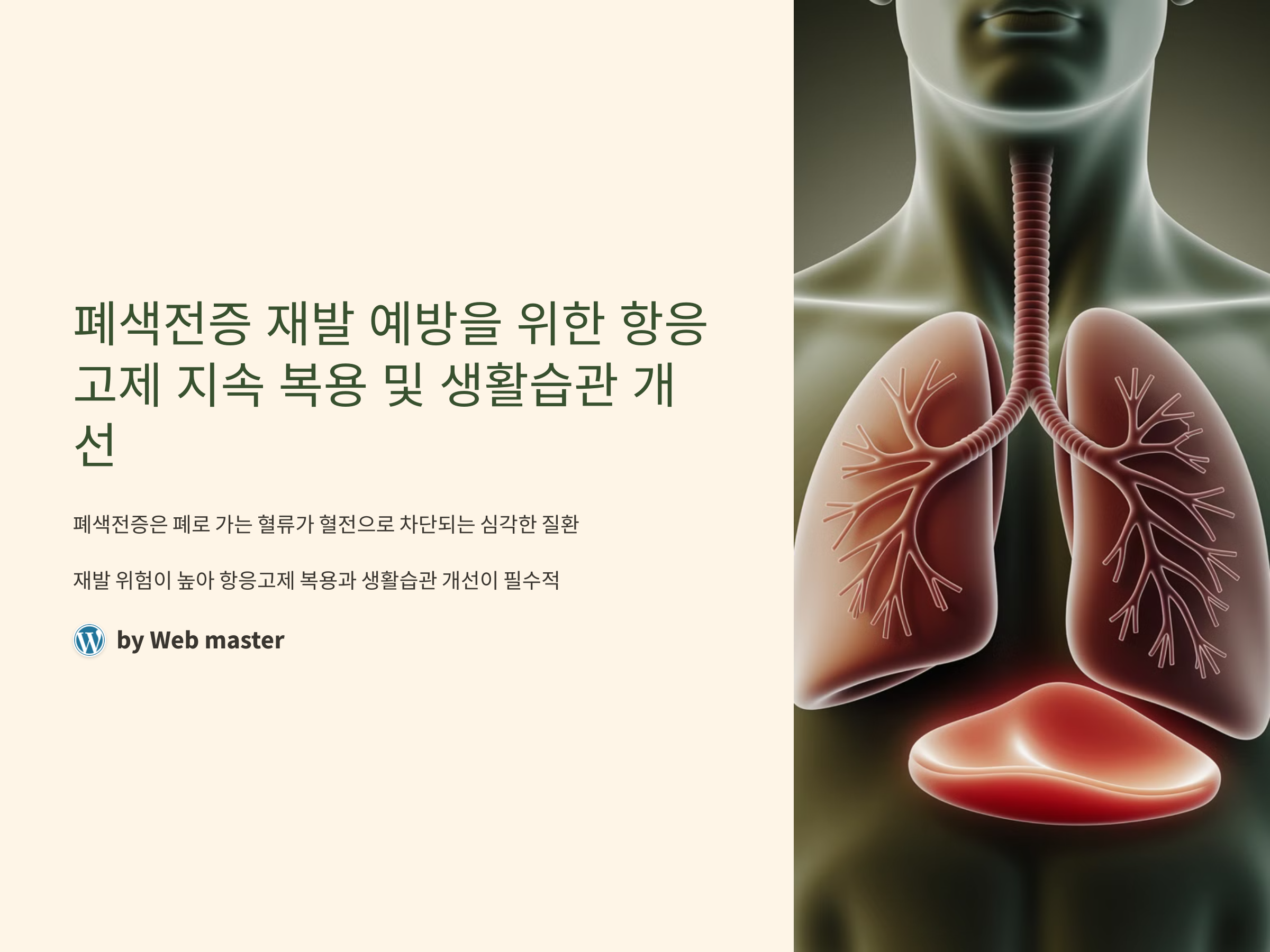 폐색전증(PE)은 심각한 질환으로, 폐로 가는 혈류가 혈전으로 차단되면서 발생합니다. 폐색전증은 생명을 위협할 수 있으며, 한 번 경험한 환자는 재발 위험이 높기 때문에 예방적인 관리가 매우 중요합니다. 폐색전증의 재발을 예방하는 핵심 방법 중 하나는 항응고제 치료의 지속적인 복용과 생활습관의 개선입니다. 이 글에서는 폐색전증 재발 예방을 위한 항응고제의 지속 복용과 생활습관 개선 방법에 대해 자세히 설명드리겠습니다.