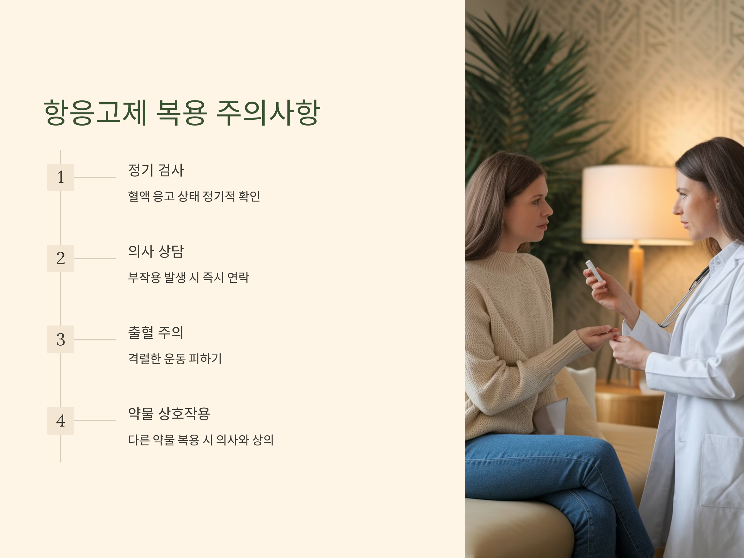 항응고제의 복용 중에는 정기적인 혈액 검사와 병원 방문이 필수적입니다. 특히 와파린의 경우 혈액 응고 상태를 정기적으로 확인해야 하며, 다른 항응고제들도 투약 시작 후 일정 기간 동안 모니터링이 필요합니다. 항응고제를 복용하면서 발생할 수 있는 부작용에 대해 환자 스스로 주의를 기울여야 하며, 의사와의 꾸준한 상담이 중요합니다.