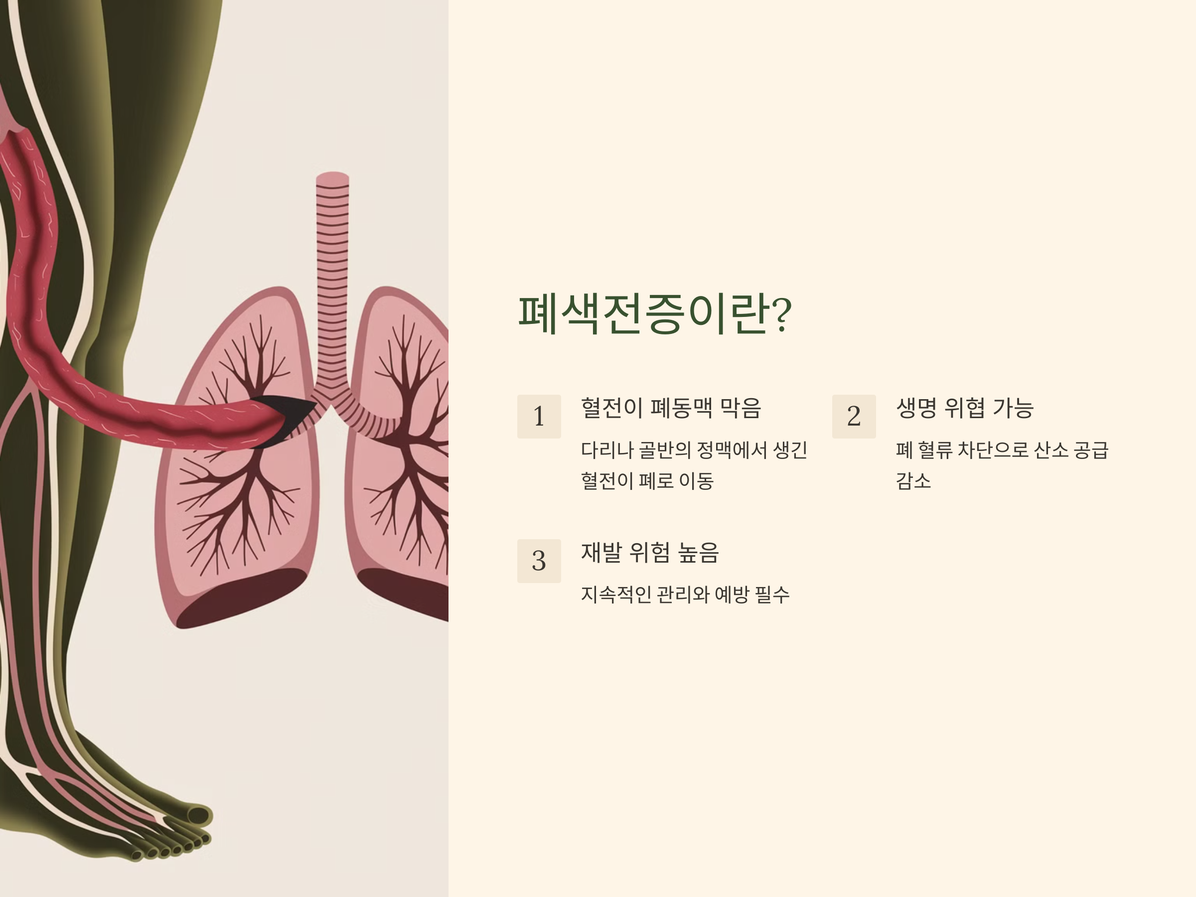 폐색전증은 혈전이 폐동맥을 막아 혈액의 흐름을 차단하는 질환입니다. 주로 다리나 골반의 정맥에 생긴 혈전이 혈류를 타고 폐로 이동하여 폐색전증을 유발하게 됩니다. 일단 폐색전증을 경험한 환자들은 혈전이 재발할 가능성이 크므로 지속적인 관리가 필수적입니다.