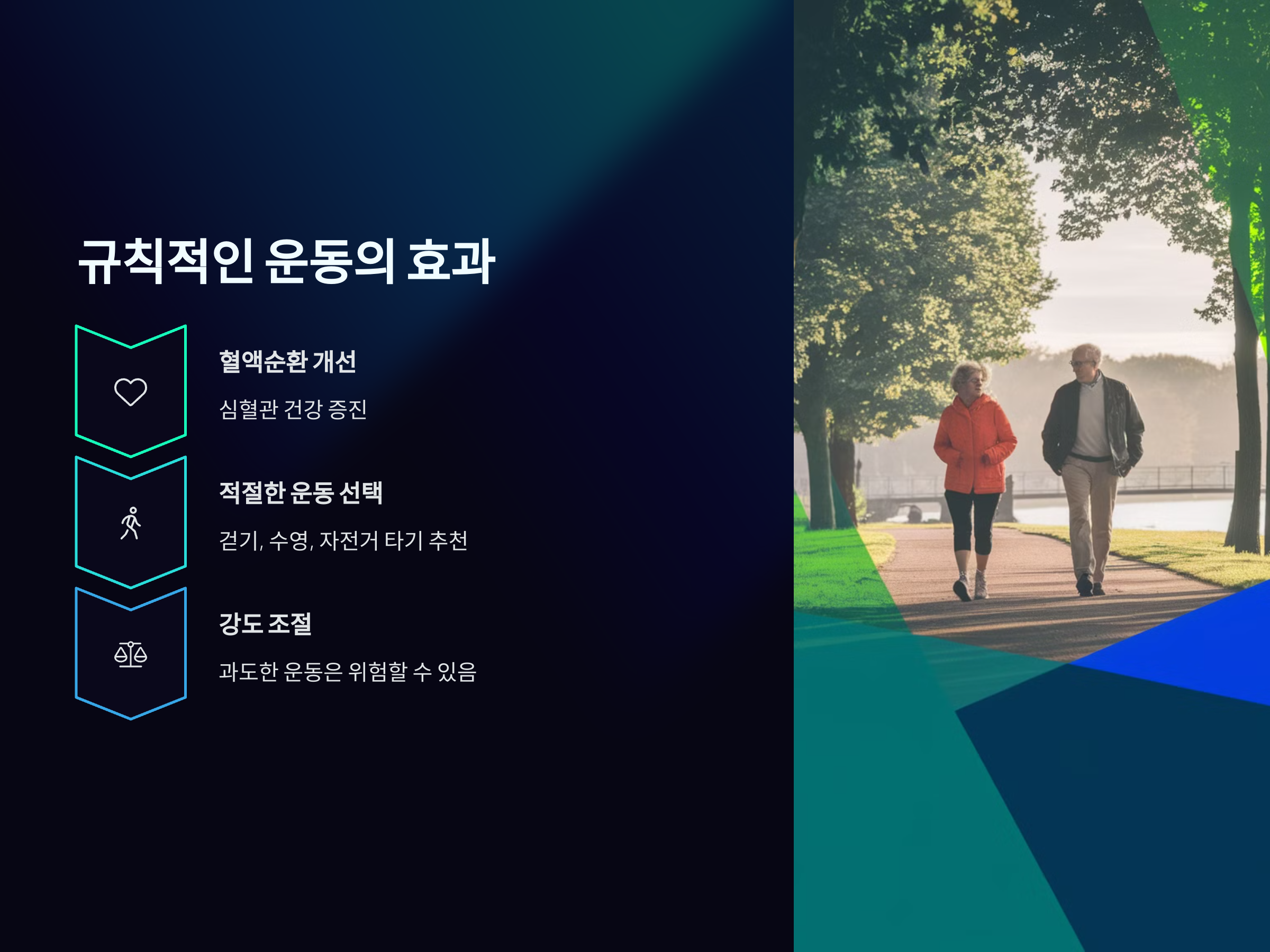 규칙적인 운동은 혈액순환을 개선하고, 혈전이 형성되는 것을 예방하는 데 매우 중요한 역할을 합니다. 운동을 통해 심혈관 건강을 증진시키고, 특히 하지의 혈액순환을 원활하게 만들어 혈전 예방에 효과적입니다. 그러나 과도한 운동은 오히려 위험할 수 있으므로, 운동의 강도와 빈도는 적절하게 조절해야 합니다. 가벼운 걷기, 자전거 타기, 수영과 같은 유산소 운동을 추천합니다.