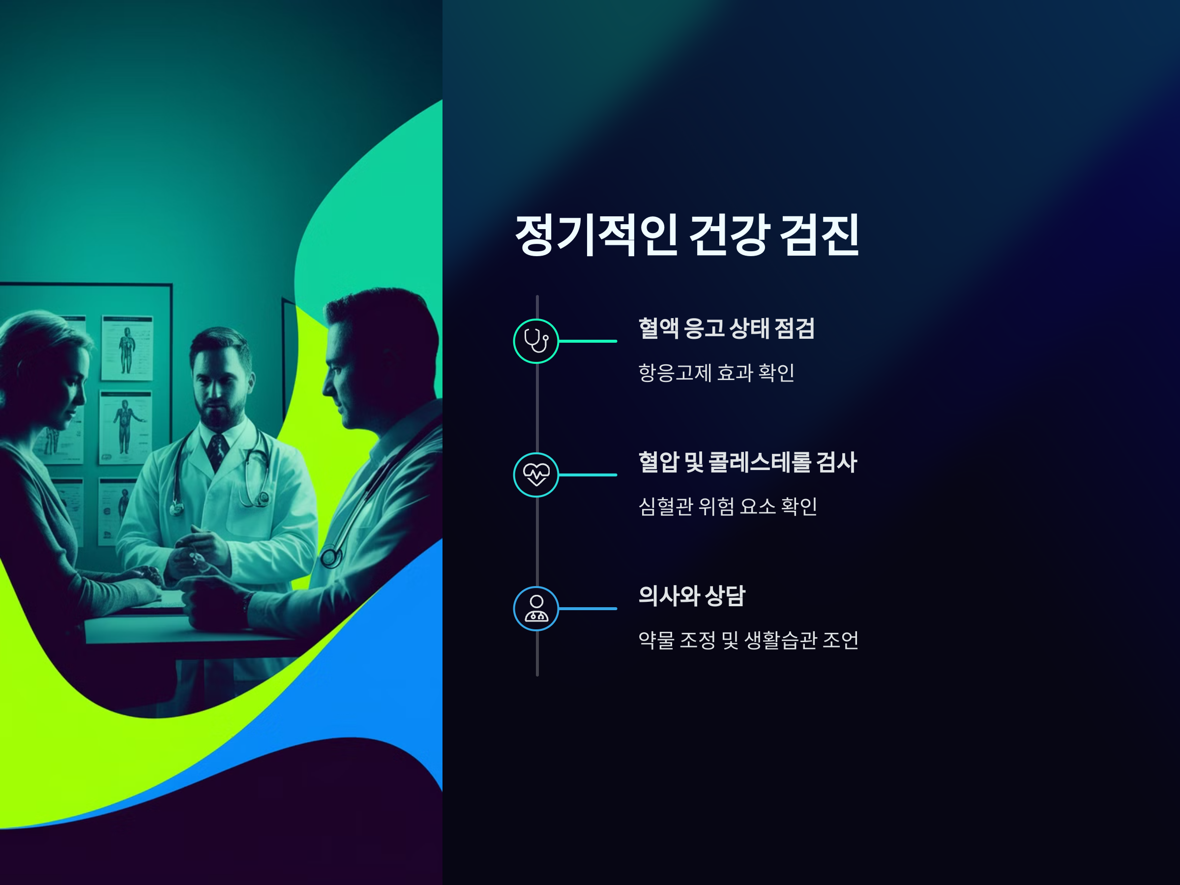 항응고제를 복용하는 동안에는 정기적인 혈액검사를 통해 약물의 효과를 확인해야 하며, 비타민 K가 풍부한 식품을 과도하게 섭취하지 않도록 주의해야 합니다. 또한, 의사의 처방에 따라 복용량을 조절해야 합니다.