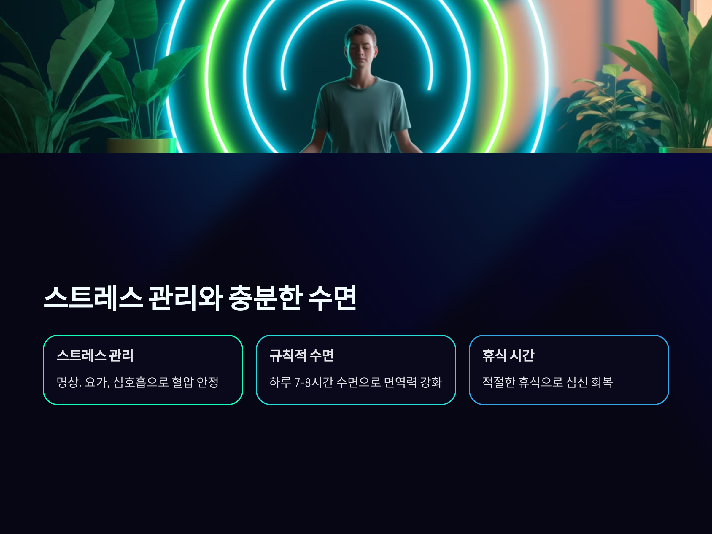 또한, 충분한 수면은 건강을 유지하는 데 중요한 요소입니다. 수면 부족은 면역력을 약화시키고, 혈액순환에 부정적인 영향을 미칠 수 있습니다. 규칙적인 수면 습관을 유지하고, 하루 7~8시간 정도의 충분한 수면을 취하는 것이 좋습니다.