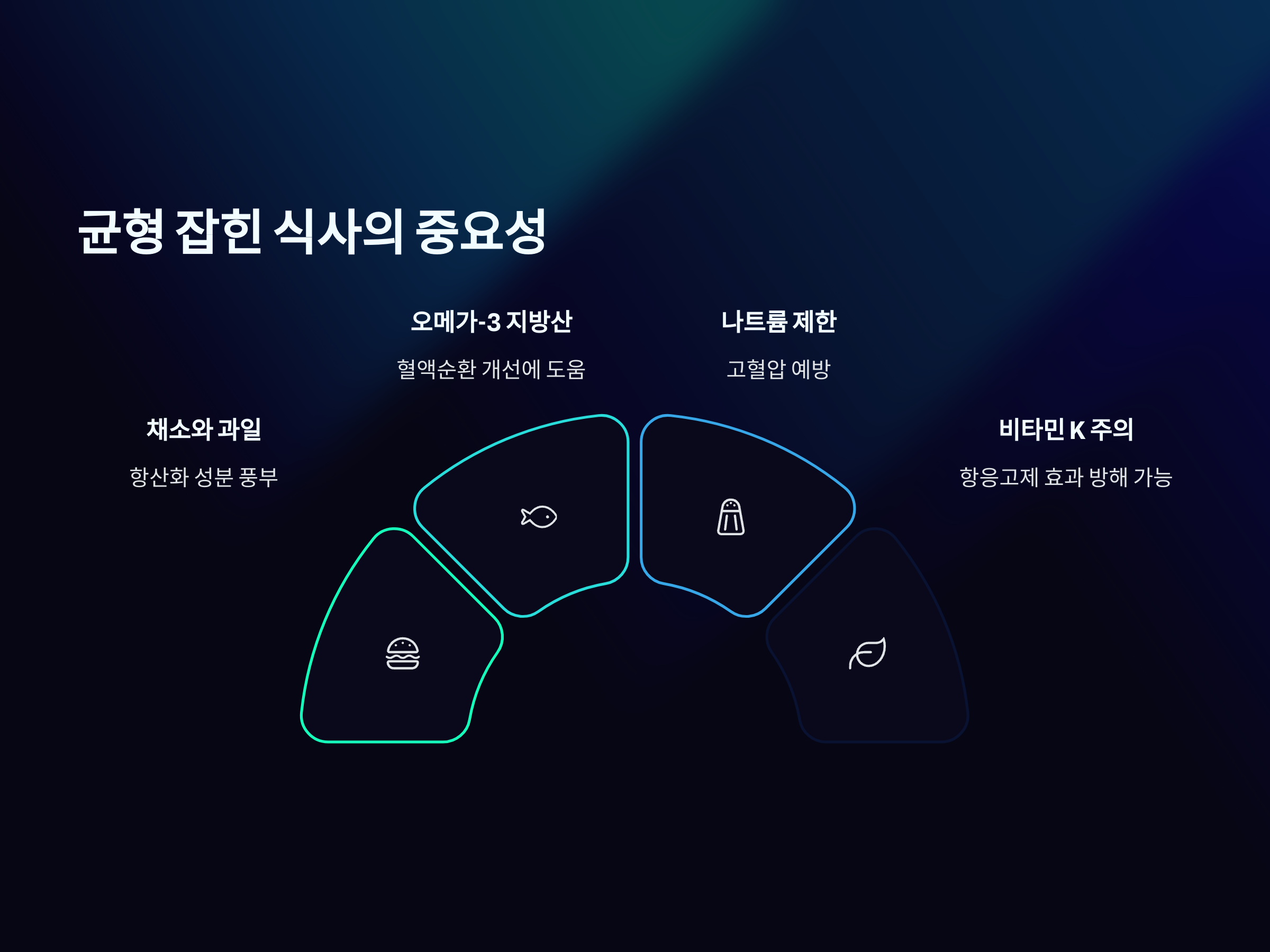 식단 또한 폐색전증 예방에 중요한 영향을 미칩니다. 건강한 식단은 혈액순환을 개선하고, 과도한 체중 증가를 막으며, 비만과 고혈압을 예방하는 데 도움이 됩니다. 특히 항응고제를 복용하는 동안에는 비타민 K가 많은 식품을 과다 섭취하지 않도록 주의해야 합니다. 비타민 K는 와파린과 같은 항응고제의 효과를 방해할 수 있습니다.
