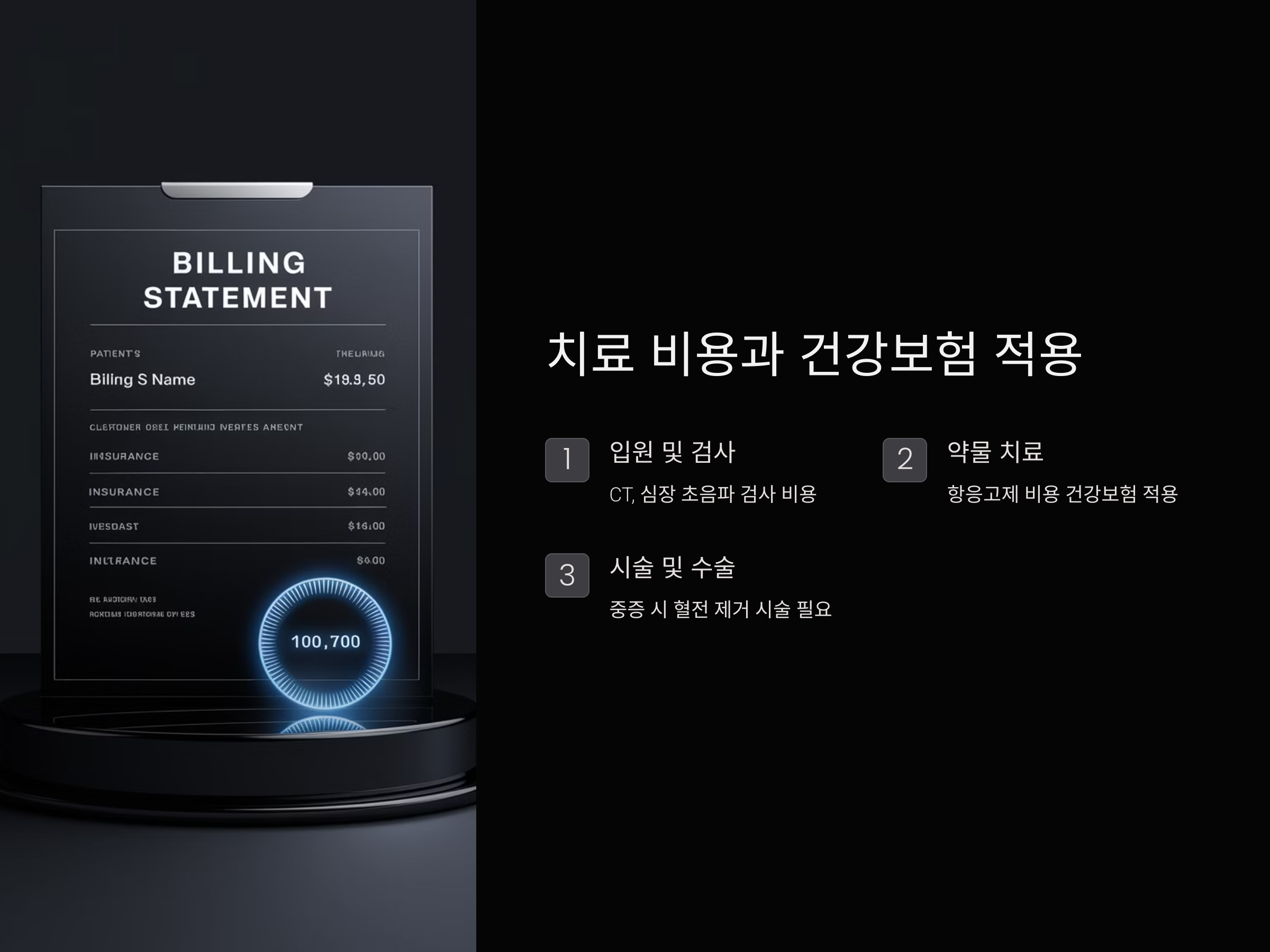 - 입원 및 검사 비용: 폐색전증 진단을 위해 전산화 단층촬영(CT), 심장 초음파 등의 검사가 필요하며, 중증도에 따라 입원 치료가 요구됩니다. 이러한 검사와 입원에 따른 비용은 건강보험의 적용을 받아 환자의 부담이 경감됩니다.