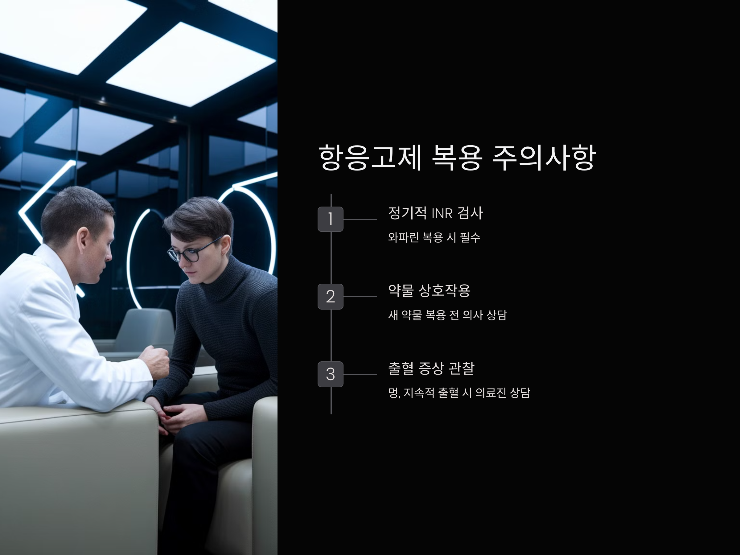 - 약물 상호작용 주의: 항응고제는 다른 약물과 상호작용이 있을 수 있으므로, 새로운 약물을 복용하기 전에 반드시 의료진과 상담해야 합니다.
