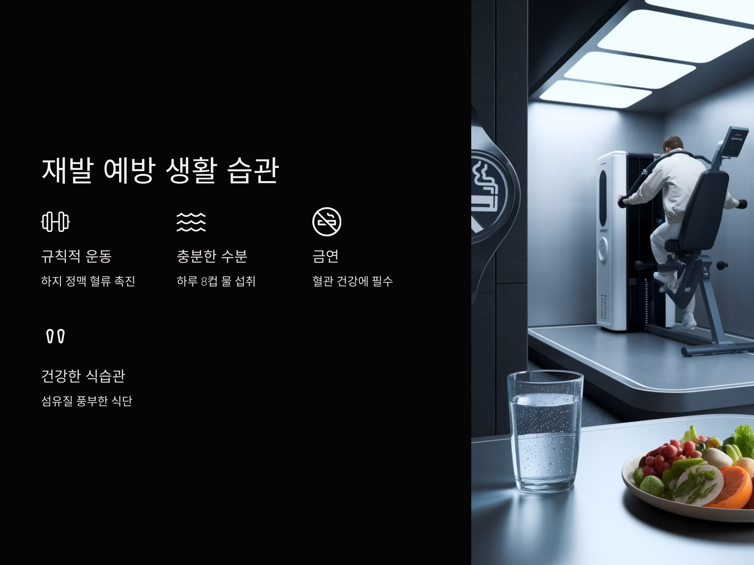 - 충분한 수분 섭취: 충분한 수분 섭취는 혈액의 점도를 낮춰 혈전 형성을 예방하는 데 중요합니다. 하루 여덟 컵의 물을 마시는 것이 권장됩니다. citeturn0search10
