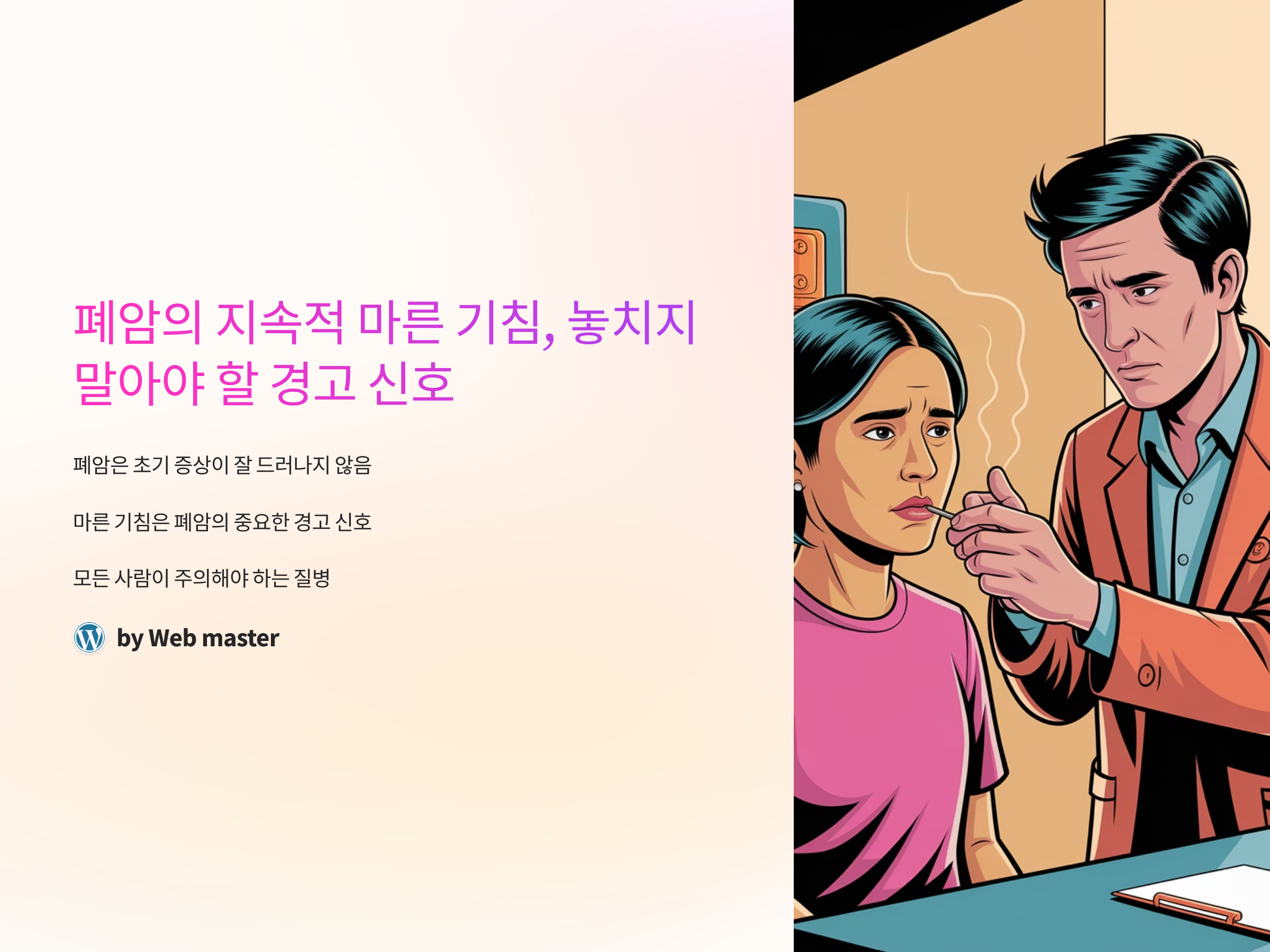 폐암은 초기 증상이 잘 드러나지 않지만, 마른 기침이 지속적으로 나타나는 경우 이를 폐암의 신호로 볼 수 있습니다. 마른 기침은 다른 호흡기 질환에서도 나타날 수 있지만, 폐암이 진행될수록 기침이 지속되고 심해질 수 있습니다. 이 글에서는 폐암의 주요 증상 중 하나인 지속적인 마른 기침에 대해 자세히 설명하고, 이를 통해 폐암을 조기에 발견할 수 있는 방법에 대해 다루겠습니다.