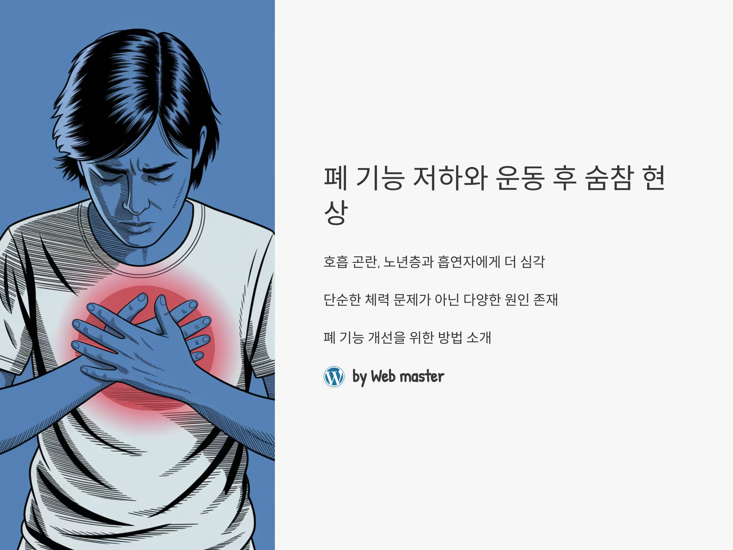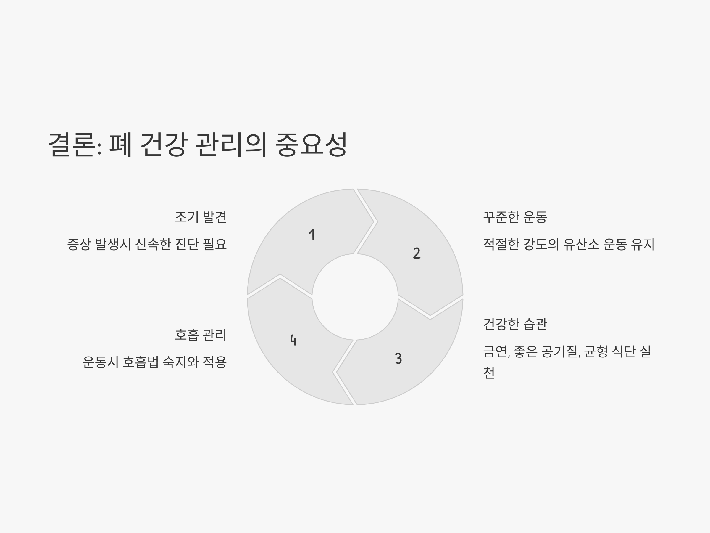 폐 기능 저하와 운동 후 숨참은 심각한 문제일 수 있지만, 적극적인 예방과 관리로 충분히 개선할 수 있습니다. 운동을 꾸준히 하고, 금연과 같은 생활 습관을 유지하면 폐 기능을 보호할 수 있습니다. 또한, 운동을 할 때는 무리하지 않고 점진적으로 강도를 높여가며 호흡을 잘 조절하는 것이 중요합니다.
