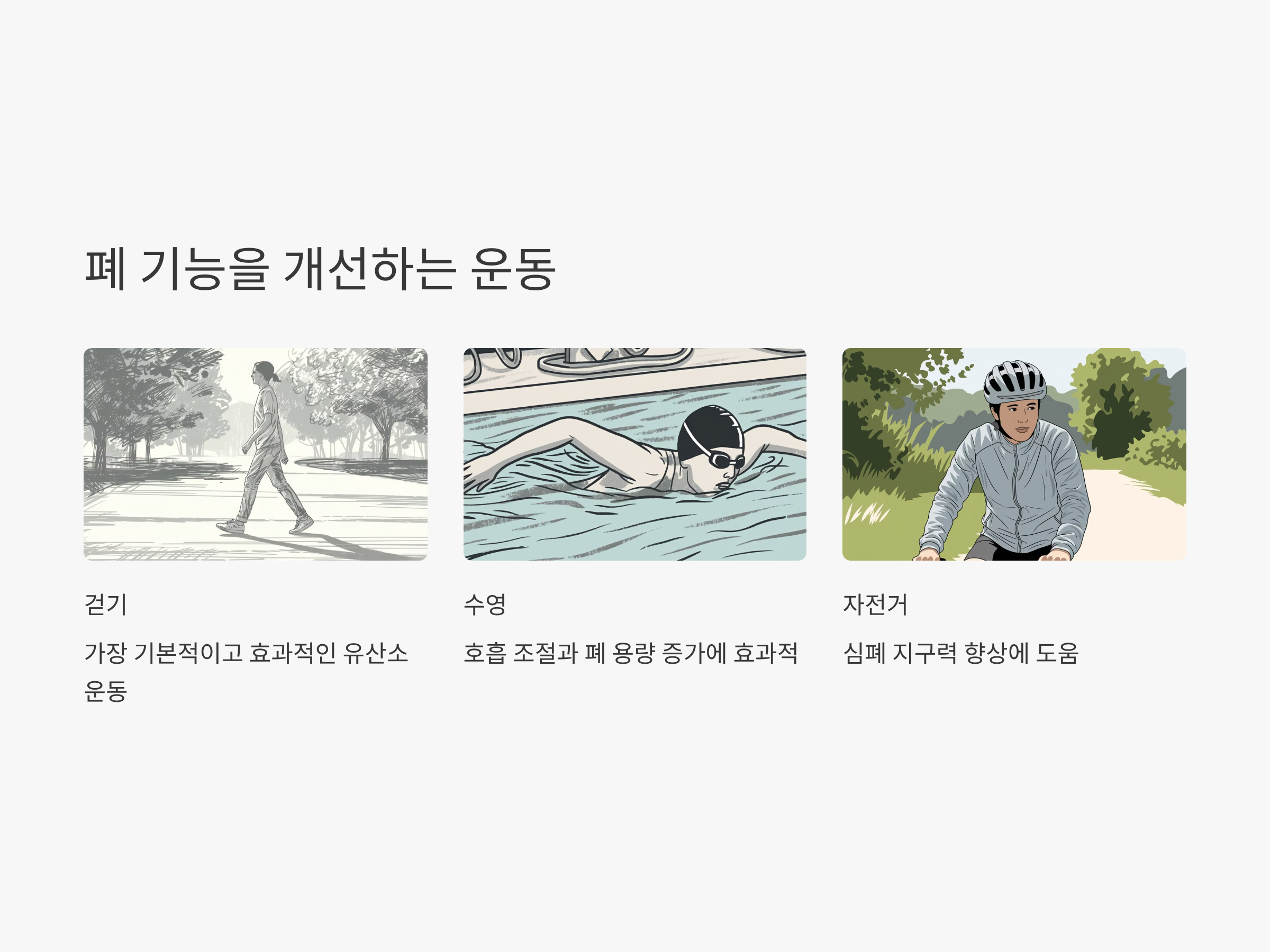 수영은 물속에서 하는 운동으로, 몸에 부담을 주지 않으면서 폐와 심장을 동시에 단련할 수 있어 특히 효과적입니다. 또한, 물속에서 호흡을 조절해야 하기 때문에 자연스럽게 호흡 능력도 향상됩니다.