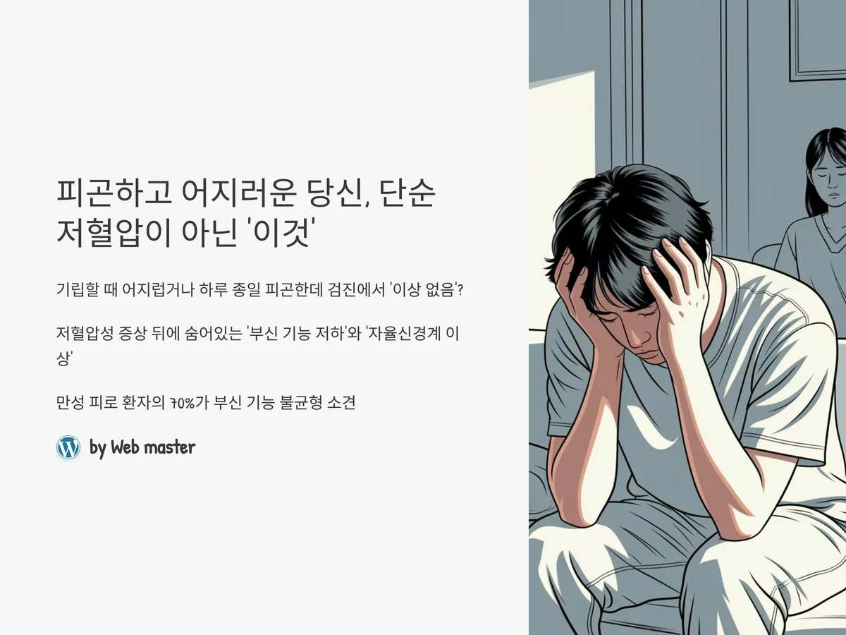 기립할 때 어지럽거나 하루 종일 피곤한 상태가 반복되는데도 병원 검진에서는 '이상 없음'이라고만 한다면, 과연 정말 아무 문제도 없는 걸까요? 최근 건강 이슈 중 하나는 바로 저혈압성 증상 뒤에 숨어있는 '부신 기능 저하'와 '자율신경계 이상'입니다. 특히 20~40대 여성들 사이에서 아침 기상이 어렵고, 무기력감과 멍한 상태가 지속되는 현상이 많아지면서 이 주제는 자가진단을 통해 접근하는 트렌드로까지 번지고 있습니다.